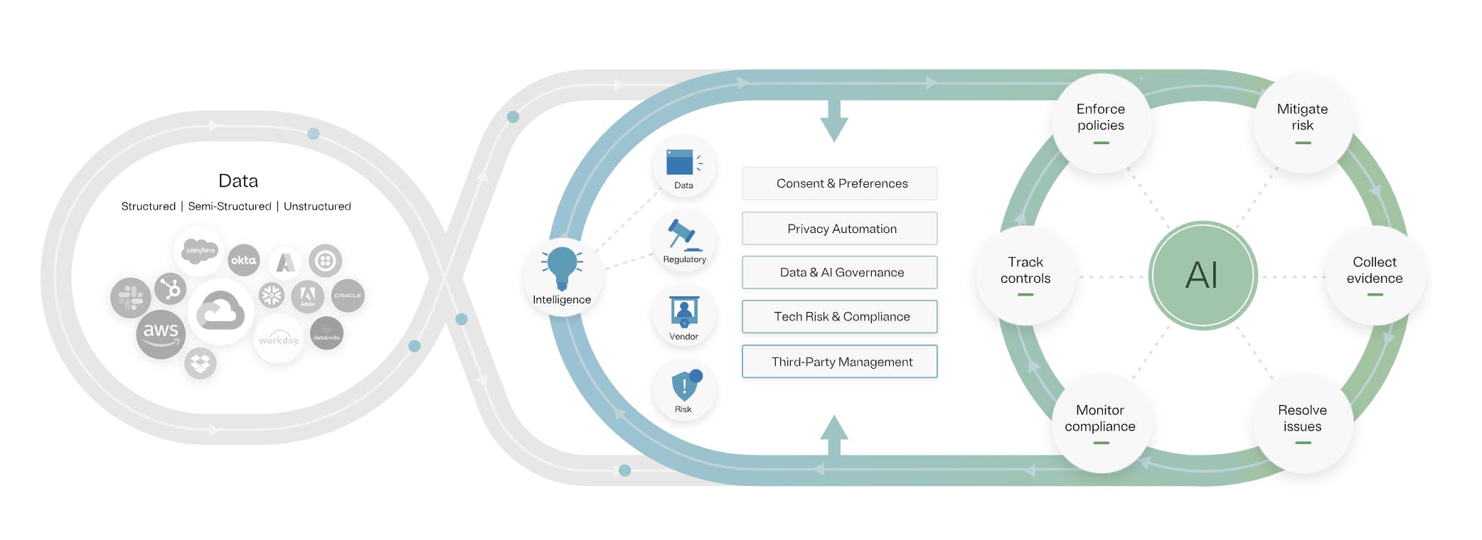 OneTrust's platform comprises five integrated solutions for data privacy, security, and compliance management. The unified architecture allows different modules to share data and workflows while maintaining access controls and compliance standards. The platform converts regulatory requirements into automated workflows that integrate with existing business processes.