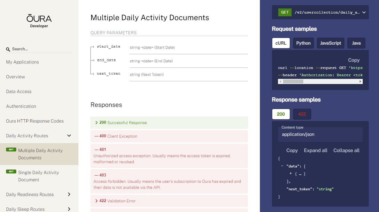 The Oura API allows developers to access and integrate user health data from the Oura platform into third-party applications and services. Third-party applications and services can access raw sensor data and processed metrics through the API, such as sleep score, activity, and readiness metrics. The API enables broader utilization and analysis of wellness data collected by the Oura Ring with wellness devices or platforms in the market.