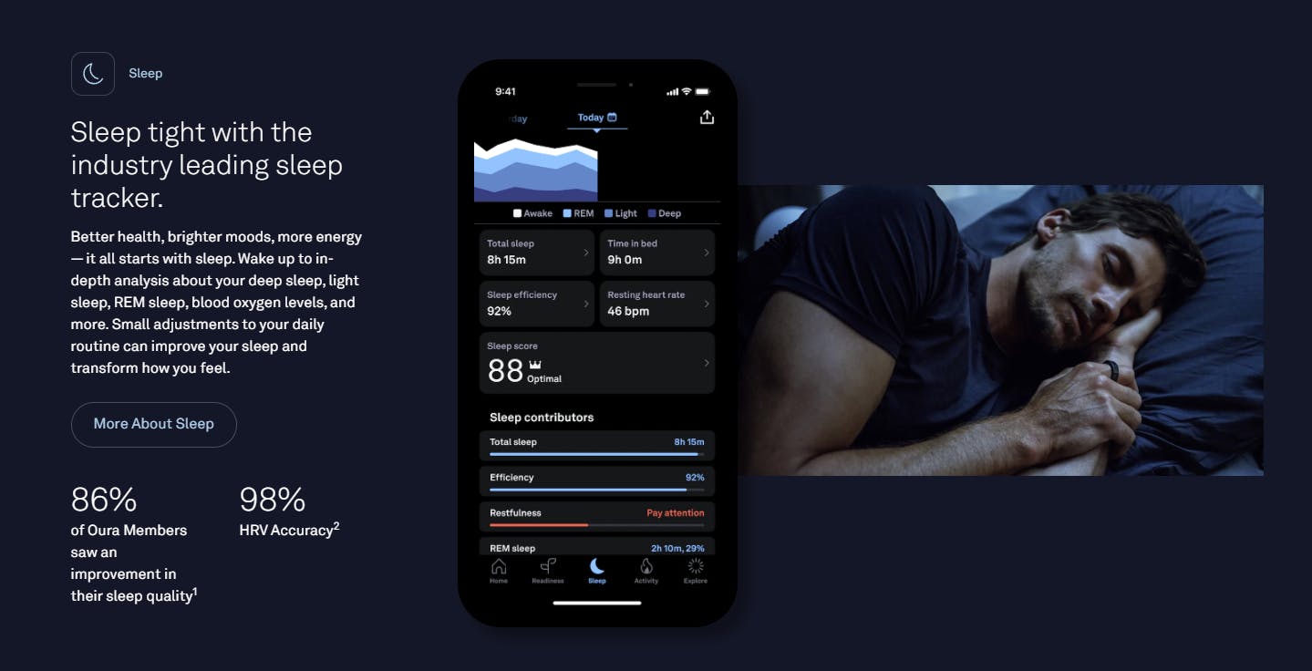 Sleep Score: This is Oura Ring’s original use case. The Sleep Score (0-100) informs users of how well they slept at night and guides them on ways to improve their sleep quality.