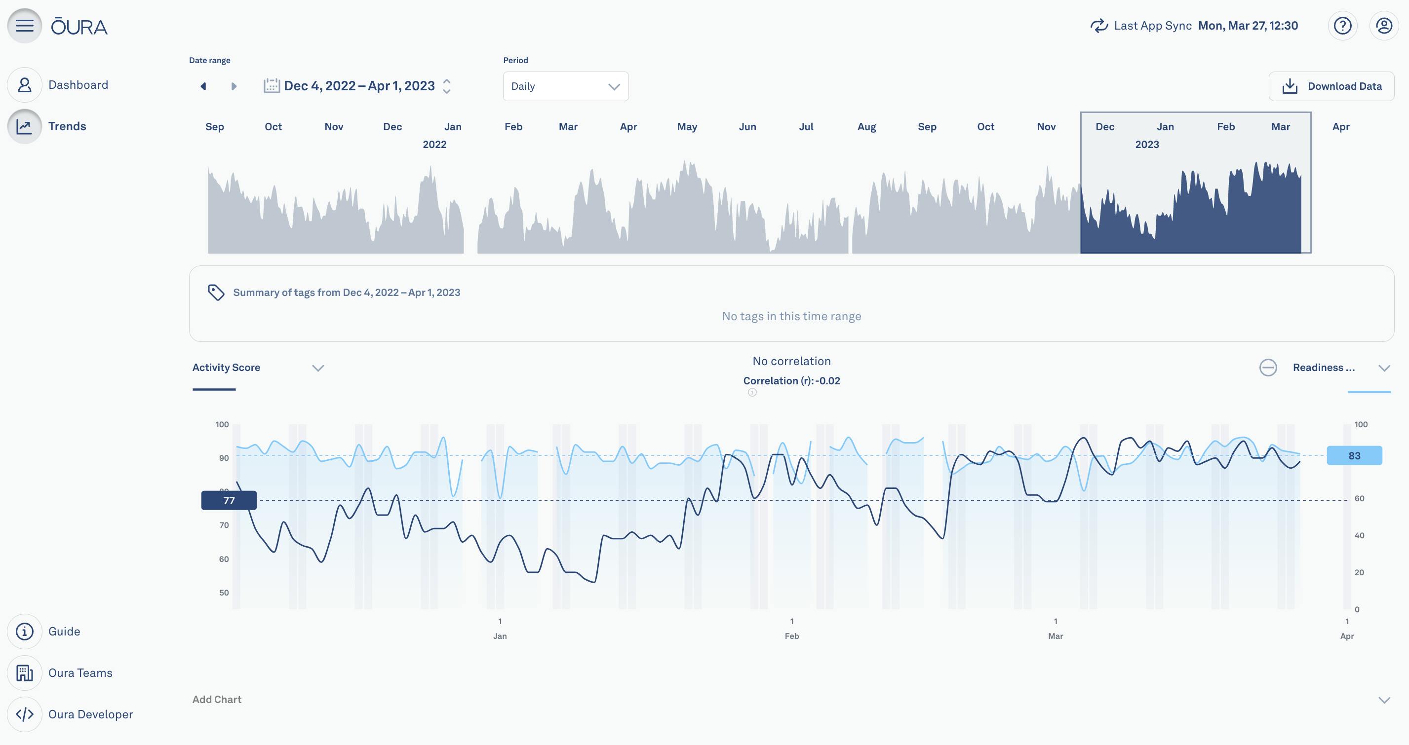 Also referred to as Oura on the Web, Oura Cloud is a platform for users to view and analyze their health data on a broader timescale. With exportable data and graphs, users can spot trends or anomalies over weeks, months, or years. Users can view their Readiness, Sleep, and Activity data from the Dashboard.