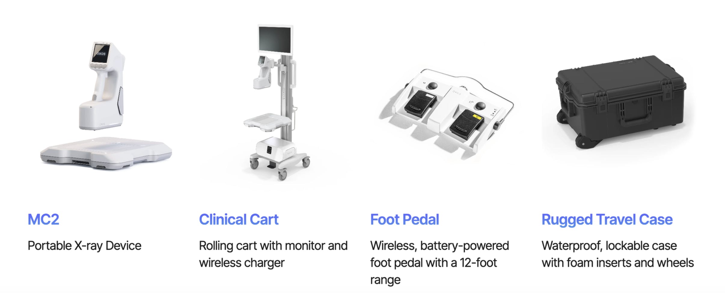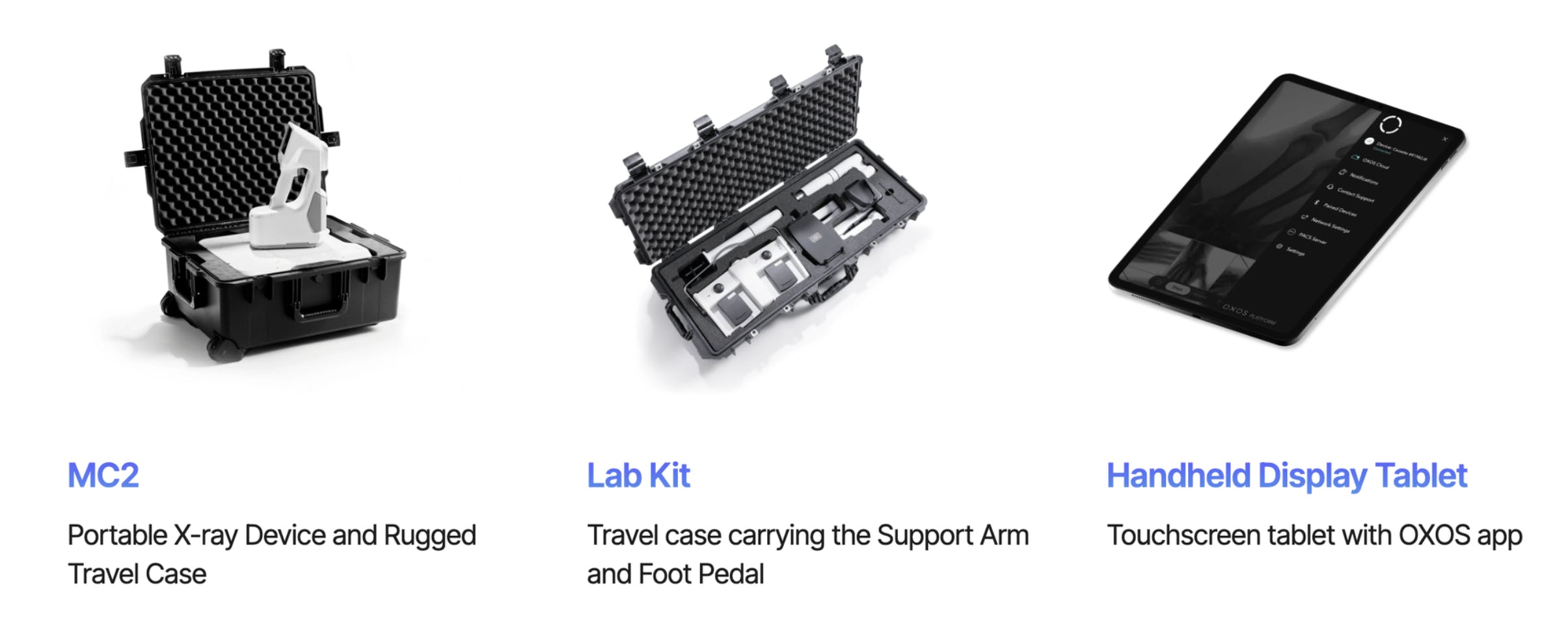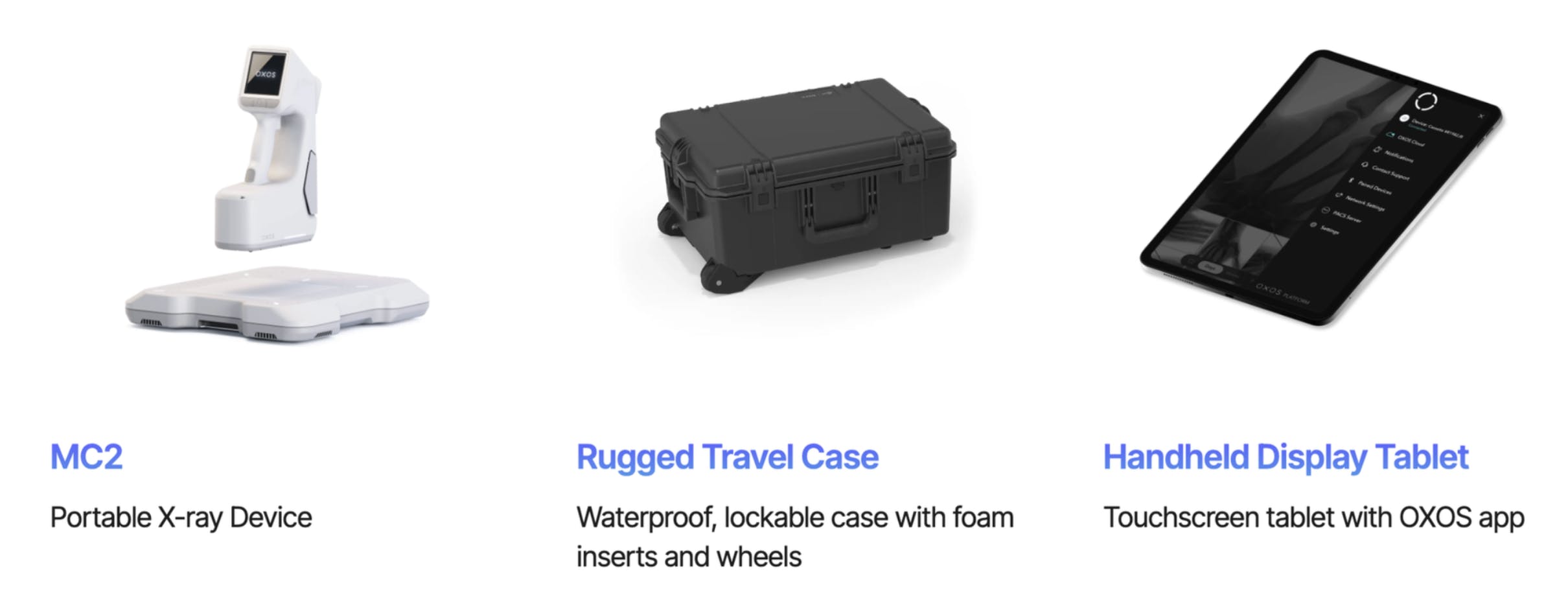 The MC2 Go is built for mobile and remote healthcare applications. This product is the most portable solution because it’s designed to be easily transported and deployed in various settings, such as ambulances, disaster response teams, military operations, and global health initiatives. The MC2 Go features a rugged travel case, a handheld display tablet that connects to the OXOS app, and wireless connectivity, allowing healthcare professionals to capture high-quality X-ray images even in challenging environments.