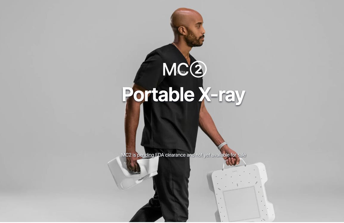 The MC2 is the core product offering for OXOS Medical as of August 2024. The product is a portable, handheld, X-ray device that has been in development since November 2021. The MC2 is the successor to the company's previous product. Incorporating feedback from Micro C users, the MC2 was designed to enhance the capabilities and user experience of portable X-ray imaging. It features four distinct modes: Radiography, Dynamic Digital Radiography (DDR), Fluoroscopy, and Photography. The system combines AI and computer vision to autonomously self-calibrate and capture sharp images at low radiation levels.