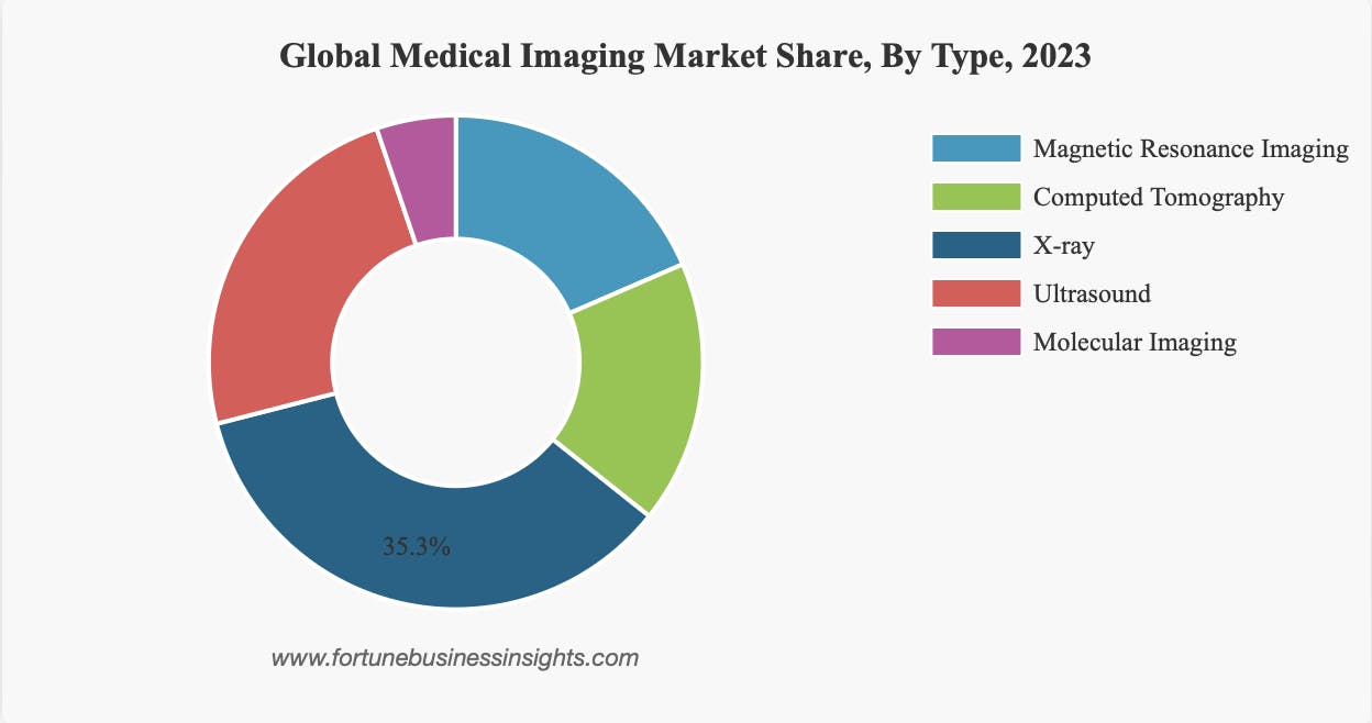 The global medical imaging market was valued at $39.8 billion in 2023 and is projected to grow at a CAGR of 4.9% from 2024 to 2030. Factors driving this growth include product innovations, the development of point-of-care medical imaging equipment, and the integration of AI technologies. These advancements are expected to improve diagnostic accuracy and efficiency, crucial for managing the healthcare demands of aging populations worldwide. In 2022, the US medical imaging market was valued at $10.6 billion. In 2023, within the global medical imaging market, X-ray imaging accounted for 35.3% of total market share.
