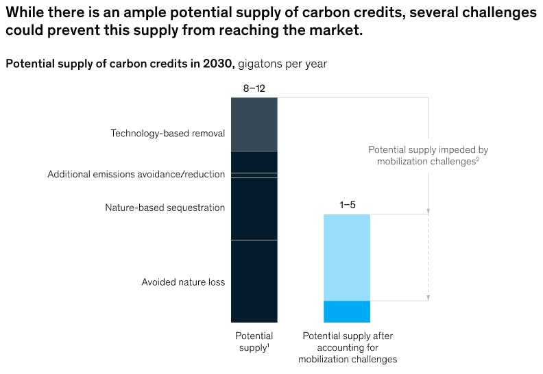 Assuming demand for carbon credits passes 10 gigatons of carbon per year by 2050, supply could be below 5 gigatons. Various obstacles to rapid supply generation include: the rate and complexity of scaling efforts, geographic concentration of carbon offsetting opportunities, difficulty attracting funding, and more. Such challenges are not unconquerable, but they require proactive efforts. If carbon offsets are to be a large portion of carbon footprint destruction before 2050, these problems should be tackled today.