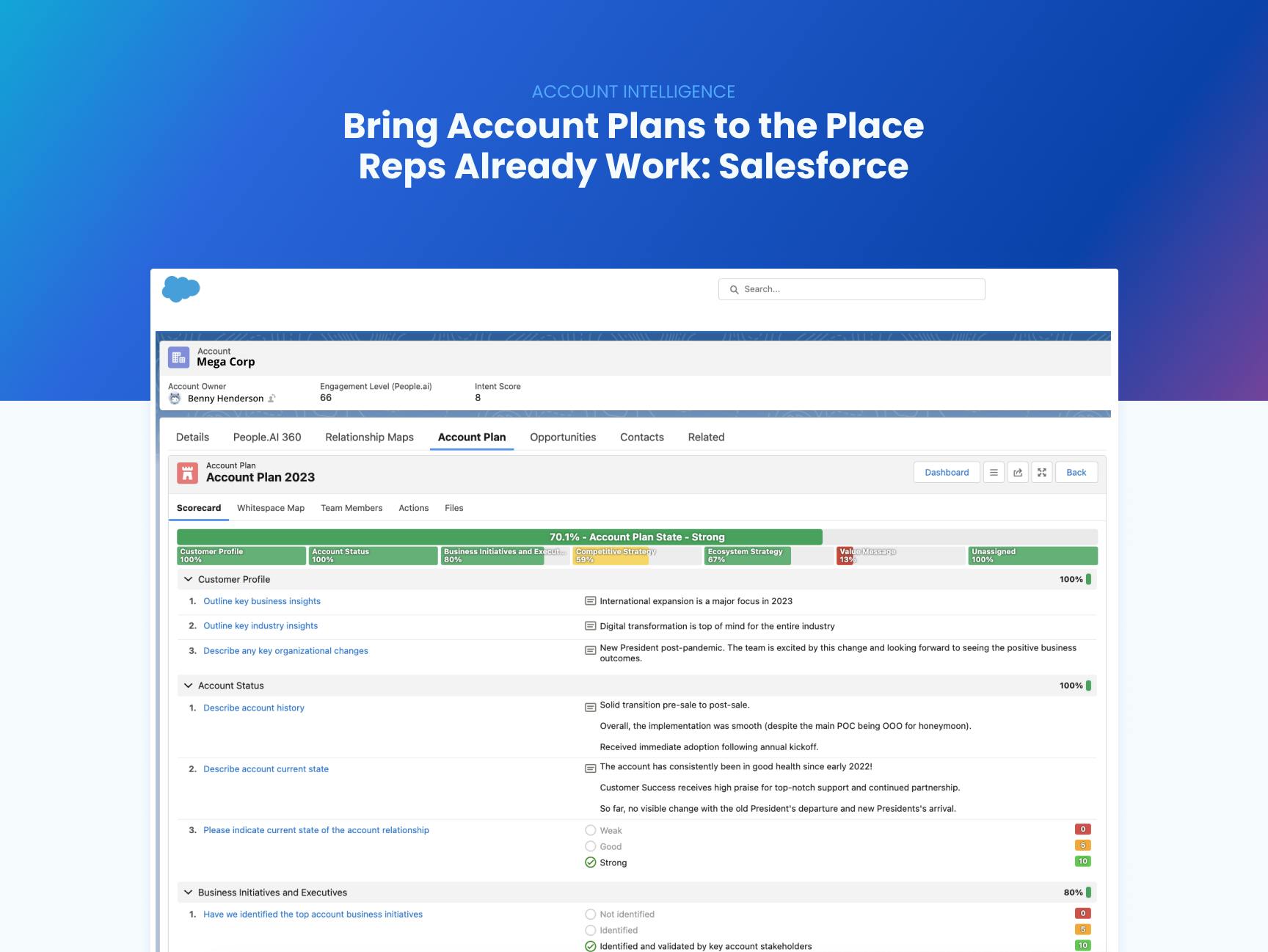 People.ai combines its data platform with Salesforce-native account management capabilities. These features are built on top of ClosePlan, a Salesforce app that People.ai acquired in October 2020. Within Salesforce, People.ai’s customizable account scorecards capture the health of prospects and customers and help reps surface and reengage dormant or at-risk accounts that may be ready to churn. They can also be a tool for sales leaders during coaching sessions.