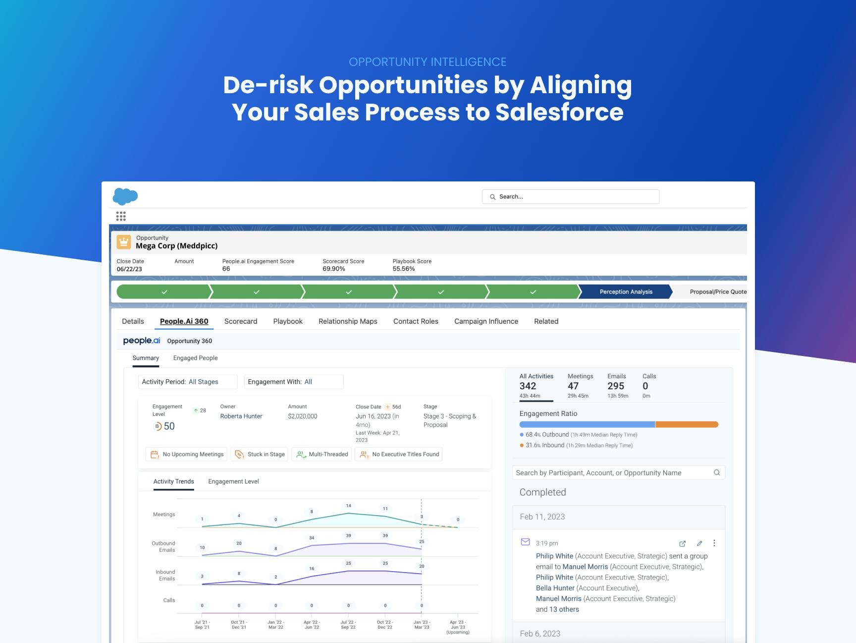Another feature is opportunity playbooks, repeatable procedures to bring deals to close. They can be customized for different deal types, including enterprise sales, renewals, cross-sells/upsell, or professional services. People.ai automates the Salesforce sales stage progression to reflect the current state of deals and provides reps with the best course of action at any deal stage.