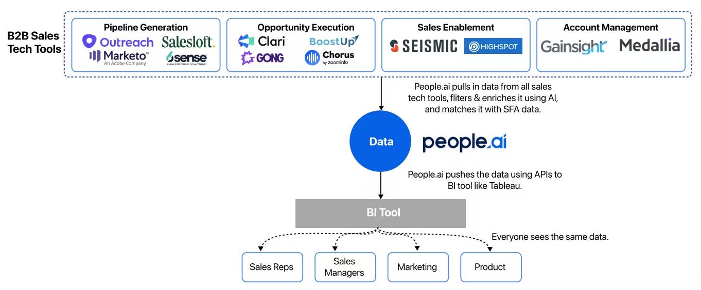 The average enterprise sales rep uses 5-10 sales tech tools, and the sales data is split across silos. People.ai is betting on the fact that salespeople don’t need another source of data. Rather than serving as another platform that users have to spend time in, People.ai hopes to build a data infrastructure that works in the background to aggregate the existing sales tech stack. In theory, this will allow it to capture a much larger market as it becomes more than a revenue intelligence tool. Their focus on creating an embedded Salesforce experience and efforts to integrate with other platforms, like Oracle CRM, has indicated the likelihood of this direction.