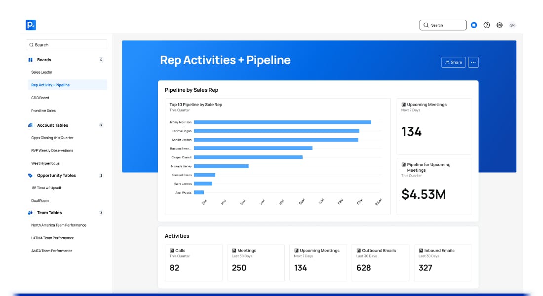 People.ai helps sales, marketing, and customer success teams uncover every revenue opportunity from every customer by capturing all customer contacts, activity, and engagement to drive actionable insights. People.ai’s product empowers sales leaders to be more effective at managing their teams and growing revenue by giving them a complete picture of sales activities and leveraging AI to deliver sales performance analytics, personalized coaching, one-on-one feedback, and pipeline reviews. Customers can use the insights from persona analysis, opportunity health, and engagement in their preferred BI solution to improve forecast predictability. People.ai has positioned itself in the enterprise revenue intelligence market by building data infrastructure that integrates with other sales tech solutions rather than seeking to replace them.