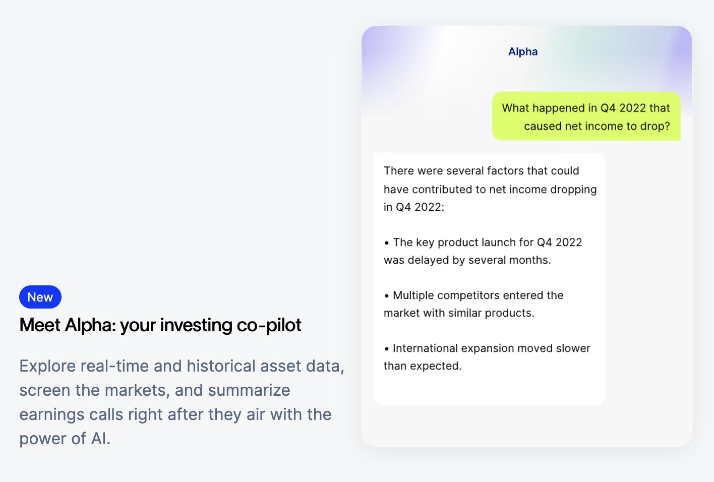 In May 2023, Public introduced a product called Alpha, an AI investing assistant powered by OpenAI’s GPT-4. Public pitches its Alpha product as an AI assistant that “instantly delivers the insights you need to make informed investment decisions”. The product was intended to reduce the amount of time that users have to spend researching and tracking their investments. It allows users to ask questions to GPT-4 and receive contextualized answers with real-time market data.