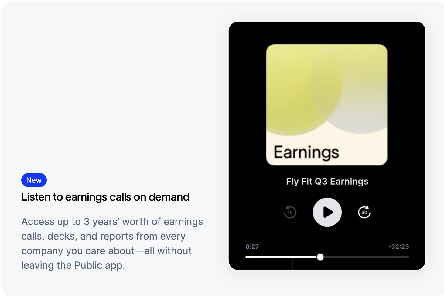 For investors looking for direct reports, Public also offers Earnings Calls on Demand. This feature provides users with access to up to three years' worth of earnings calls, decks, and reports from most major companies, which may be accessed via the Public app. The value of Earnings Calls on Demand lies in its ability to provide easy access to historical earnings through a low-effort format (audio) instead of having to read through complicated documents.