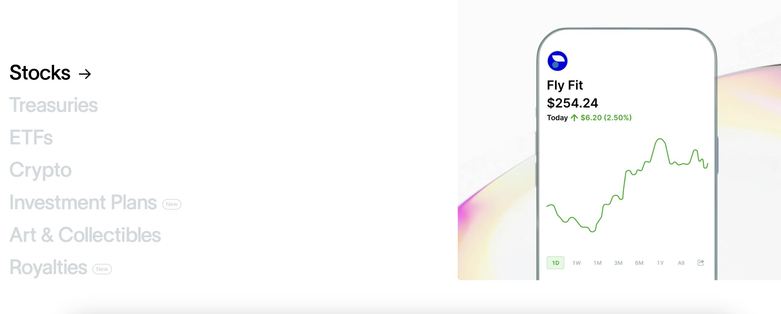 Public allows users to buy fractional shares in artworks and collectibles, such as “rookie patch auto” (RPA) rookie sports cards. Such assets are illiquid and have higher risk than more traditional assets and equities, so Public requires users to acknowledge the risks before opting in to purchasing alternative assets. However, this capability allows Public users to diversify their portfolios further.