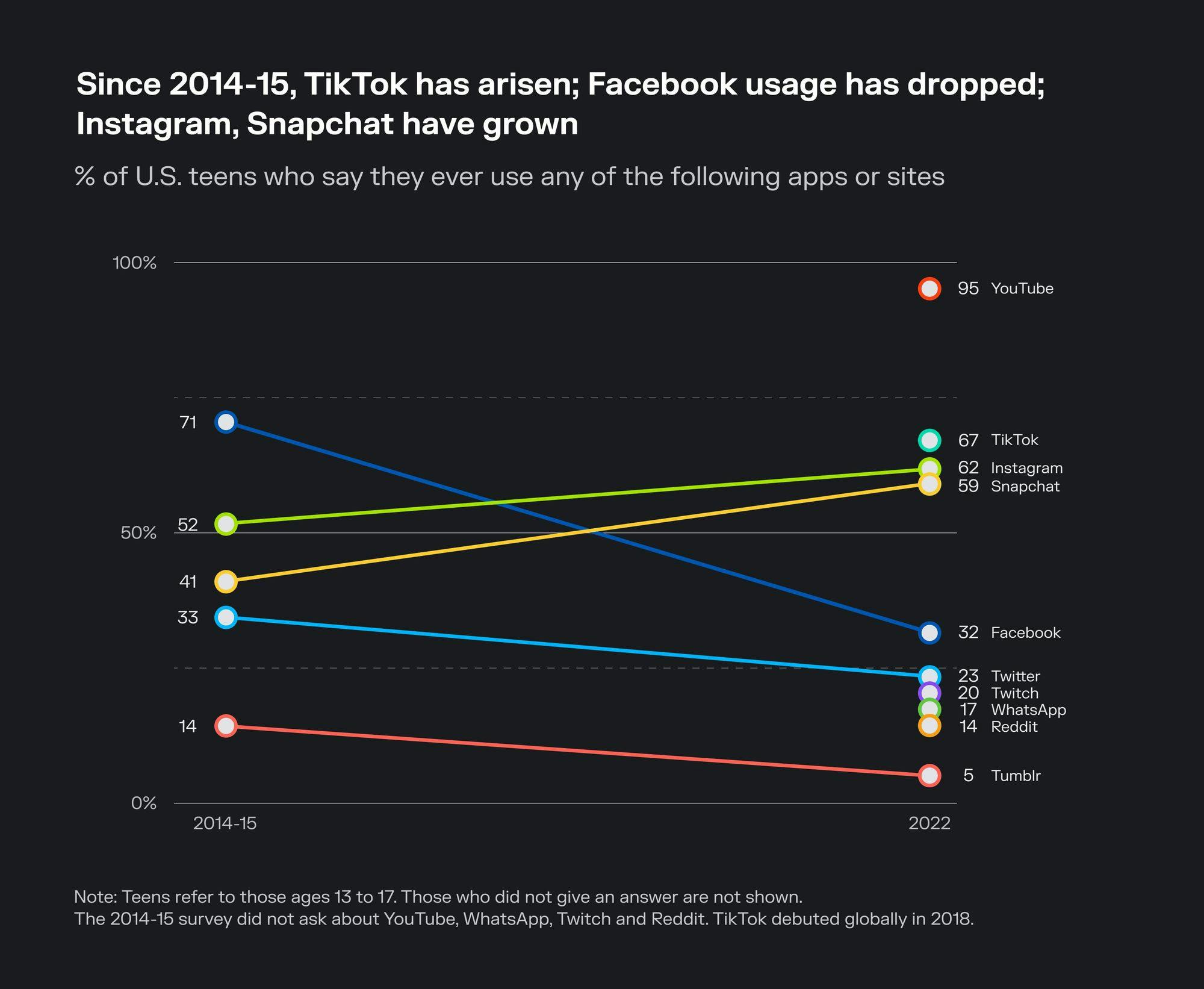 Reddit’s primary competition comes from Twitter, Facebook, TikTok, and Quora. 4chan is similar in terms of style (i.e. text-based posts). However, Reddit has significantly outgrown 4chan; 4chan had around 20 million monthly active users (MAUs) as of 2022, compared to Reddit’s 430 million by 2020, which had grown to roughly 850 million by 2023. User preferences continue to shift, indicating that the next 10 years of social networks will be unlikely to look like the last 10 years. In early 2022, Facebook’s global user count declined for the first time, showing some weakness in its continuous growth run. Facebook has also struggled to compete for the attention of younger users, many of whom are drawn to newer entrants like TikTok.