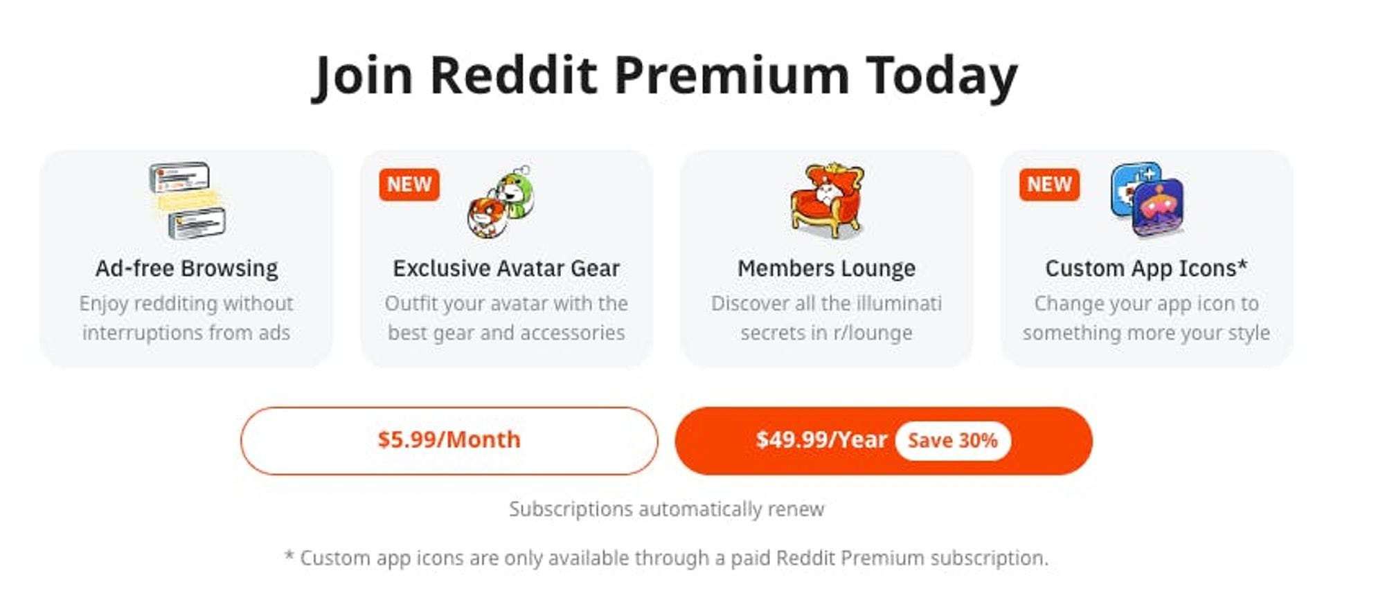 Reddit has a paid subscription which allows users to “support Reddit, get VIP treatment, exclusive access, and monthly coins.” Users have the option to pay $5.99 per month or $49.99 per year. With Premium, Redditors receive an ad-free experience, a personalized avatar (”snoovatar”), and access to r/lounge, an exclusive member-only subreddit.
