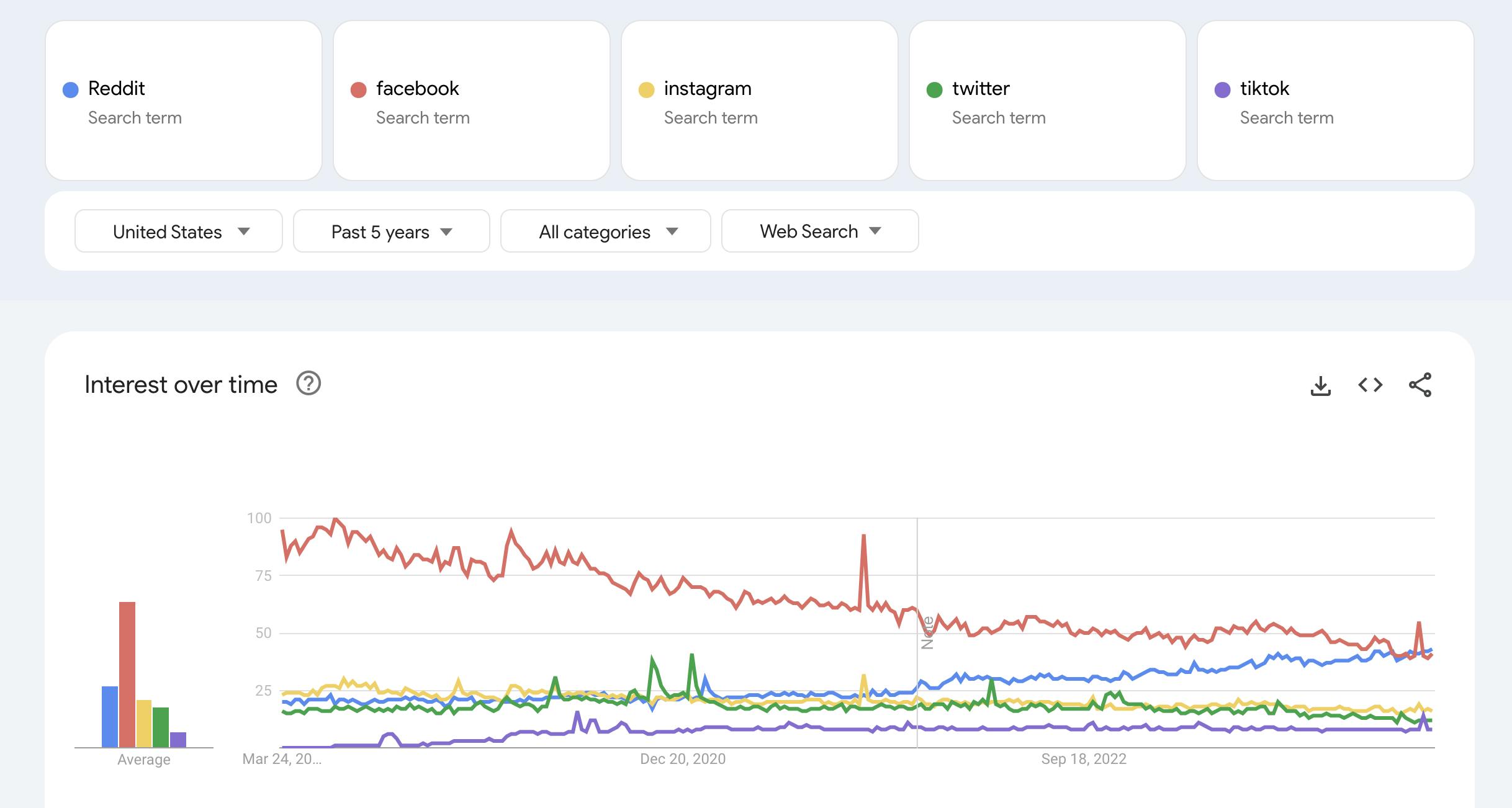 Reddit’s content-focused, pseudonymous platform is less likely to experience user attrition in the same way as other social media. The opportunity for Reddit is to continue to lean into a community-centric approach and to become a place where people will still come to find niche information around their interests even as they avoid the more identity-driven social platforms. According to a Google Trends report from March 2024, Reddit has seen a steady increase in search interest in the previous five-year period within the United States relative to other social media platforms.