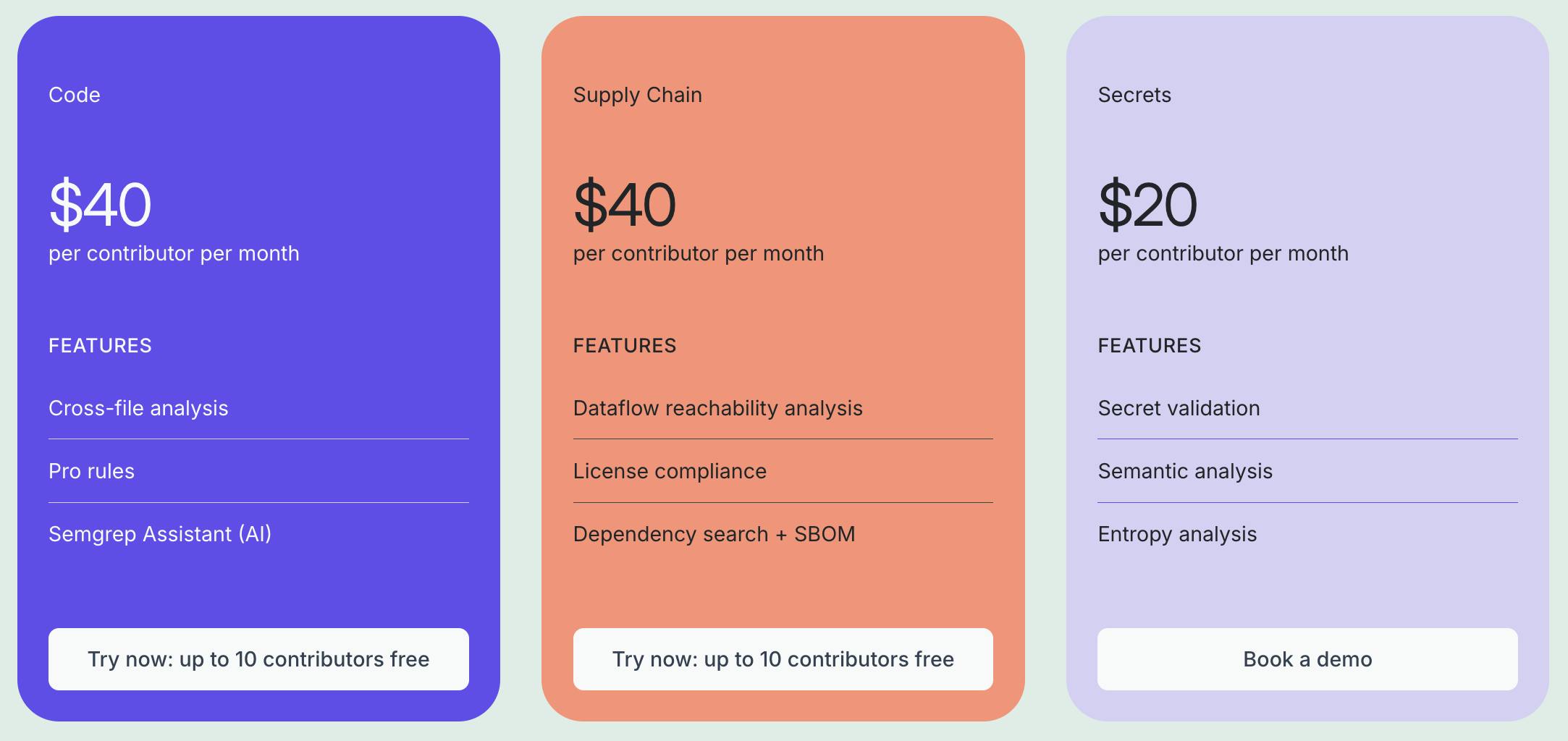Similarly, Semgrep Supply Chain also charges $40 per contributor per month, offering dataflow reachability analysis, license compliance, and dependency search.