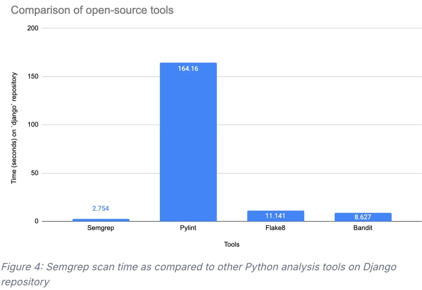 In addition to accurate query results, Semgrep also delivers scans that outperform other open-source tools. It focuses on single-file analysis, so the control flow graph—the representation of all possible paths through a program—never exceeds the size of a single file. As the tool tracks the flow of potentially harmful data through the entire program using taint analysis, it collects taint summaries incrementally and stitches them together.