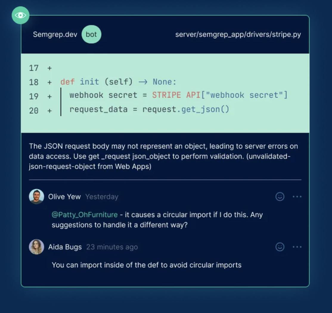 A key advantage of the Semgrep AppSec Platform is its ability to engage developers directly within their existing workflows. Developers can work on code changes without disrupting their feature development velocity because the platform displays pull request discussions exactly where they need them. Its diff-aware scans focus on issues in current code changes rather than accumulating past issues, enabling developers to concentrate on what is immediately relevant.
