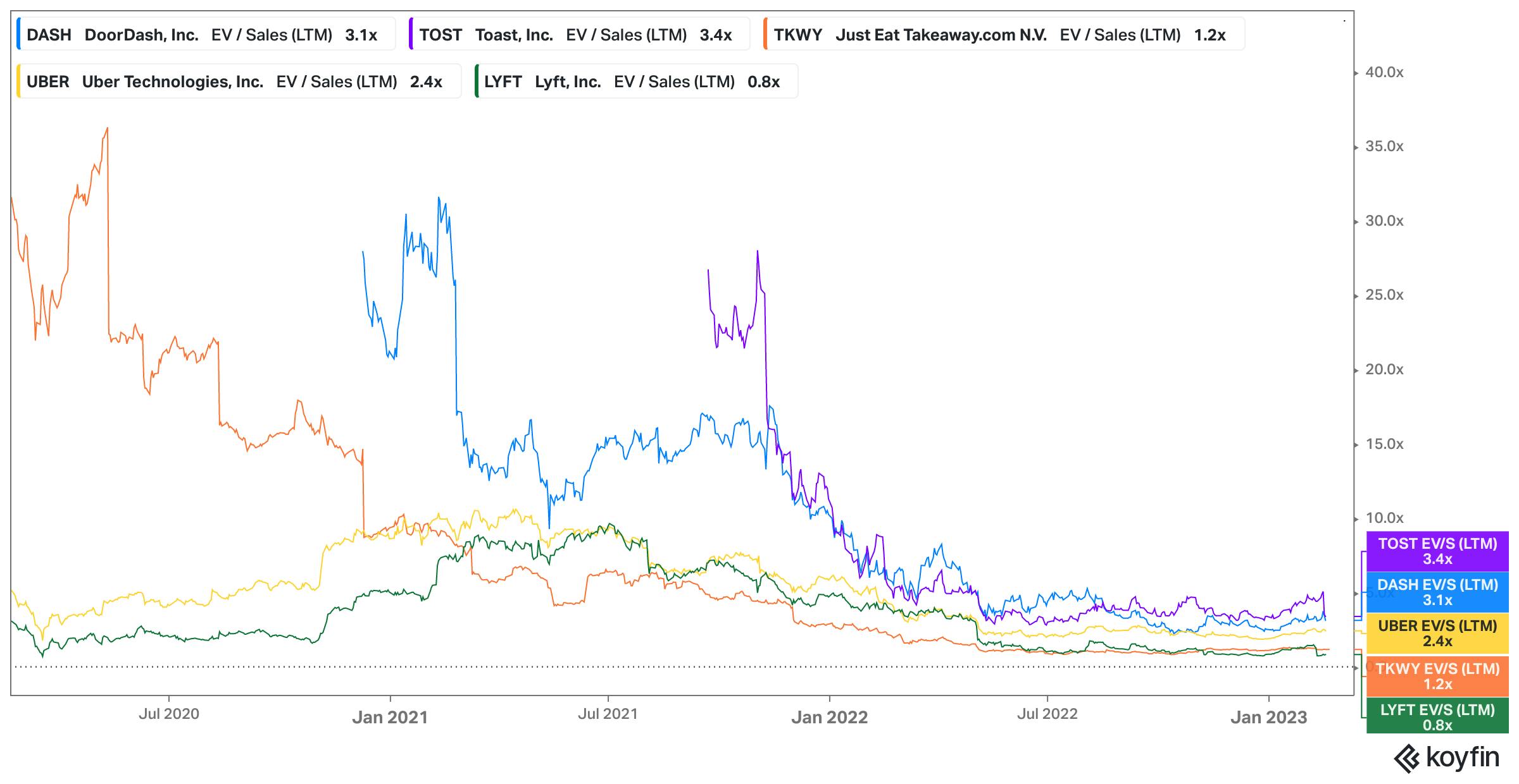 Comparable restaurant software and marketplace companies like Toast, Doordash, Just Eat Takeaway, Uber, and Lyft are currently trading between 0.8-3.4x revenue, down from a high for some of these companies of ~30-40x revenue in 2020-2021. Applying a 10x revenue multiple to Slice’s ~$100 million estimated revenue would imply a valuation of ~$1 billion.