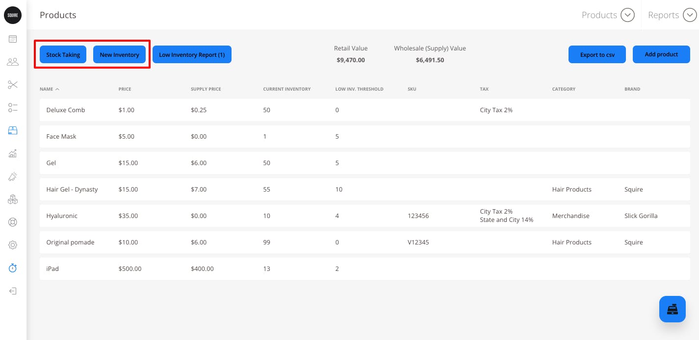 Squire offers an inventory management module that allows barbershops to add and remove products in their inventory and track the inventory they sell or use. They can audit their inventory for shrinkage. Squire features a marketplace for barbershops to buy common supplies they need to operate their business, as well as to upsell grooming products to consumers after a shave or a haircut.