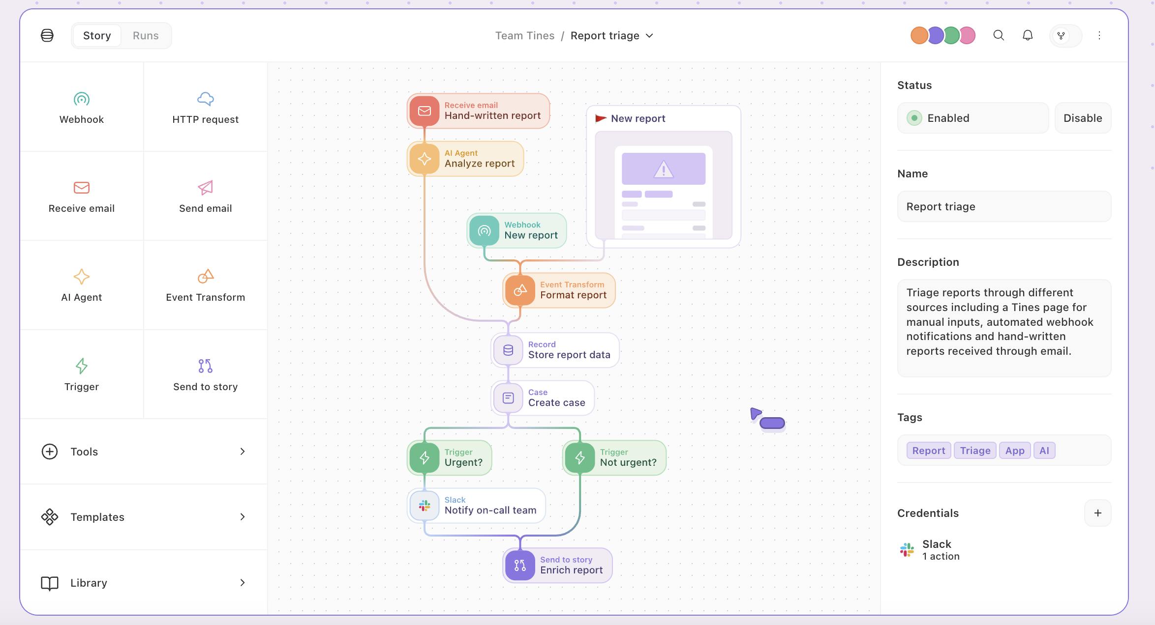 In 2024, Tines introduced native AI-powered features to make workflow automation even more powerful and accessible. Notably, Tines added an “Automatic Mode” in June 2024 for its Event Transformation action and AI Action, both leveraging large language models (LLMs) implicitly.