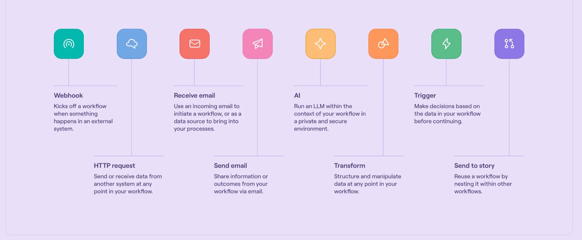 Tines provides eight types of actions covering common automation tasks. For example, there are actions for sending or receiving emails, making HTTP requests to interact with REST APIs, performing data transformations on events, evaluating trigger conditions, and more. Each action type has specialized options: the Email actions handle IMAP/SMTP details, the Webhook action listens for inbound webhooks, etc. But all share a common interface and can pass data to one another. This uniform event-passing mechanism means users can connect any sequence of actions to craft the needed workflow logic. Tines even supports nested workflows via a “Send to Story” action, allowing one story to call another, promoting reusability and modular design. This story paradigm lets users build sophisticated automation “playbooks” by linking simple, configurable actions all through a point-and-click interface, with no coding required.