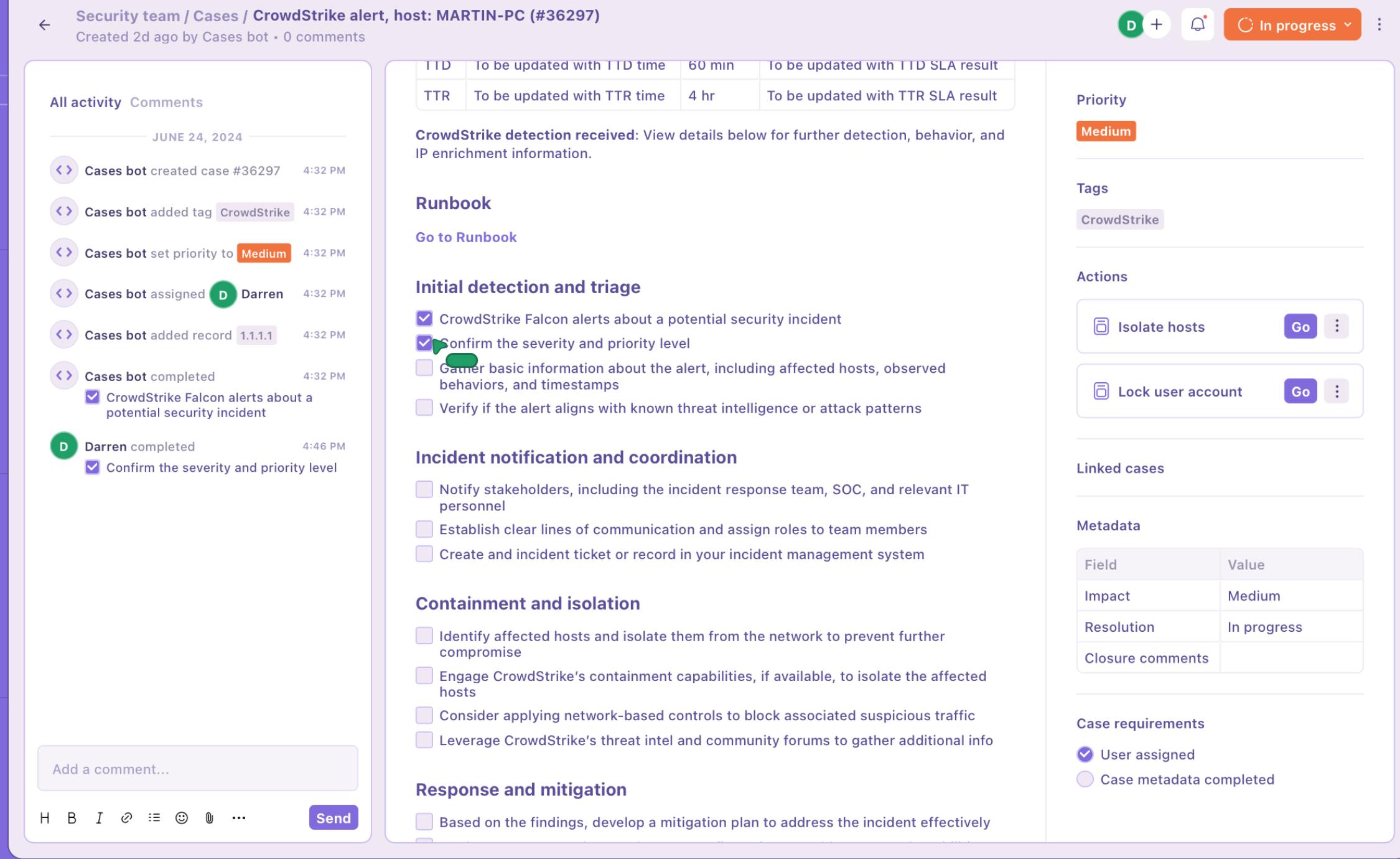 Cases are a solution for collaborative case management and incident tracking. A Case in Tines provides a shared workspace where team members can investigate and remediate an incident together, with the ability to comment, take manual actions, and record progress in real time. As automation runs behind the scenes, analysts can use a case to oversee the incident, attach findings, and coordinate responses within the Tines platform. “Investigate, remediate, and report on an incident in a collaborative workspace with Tines’ powerful, intuitive case management,” explains the official description.