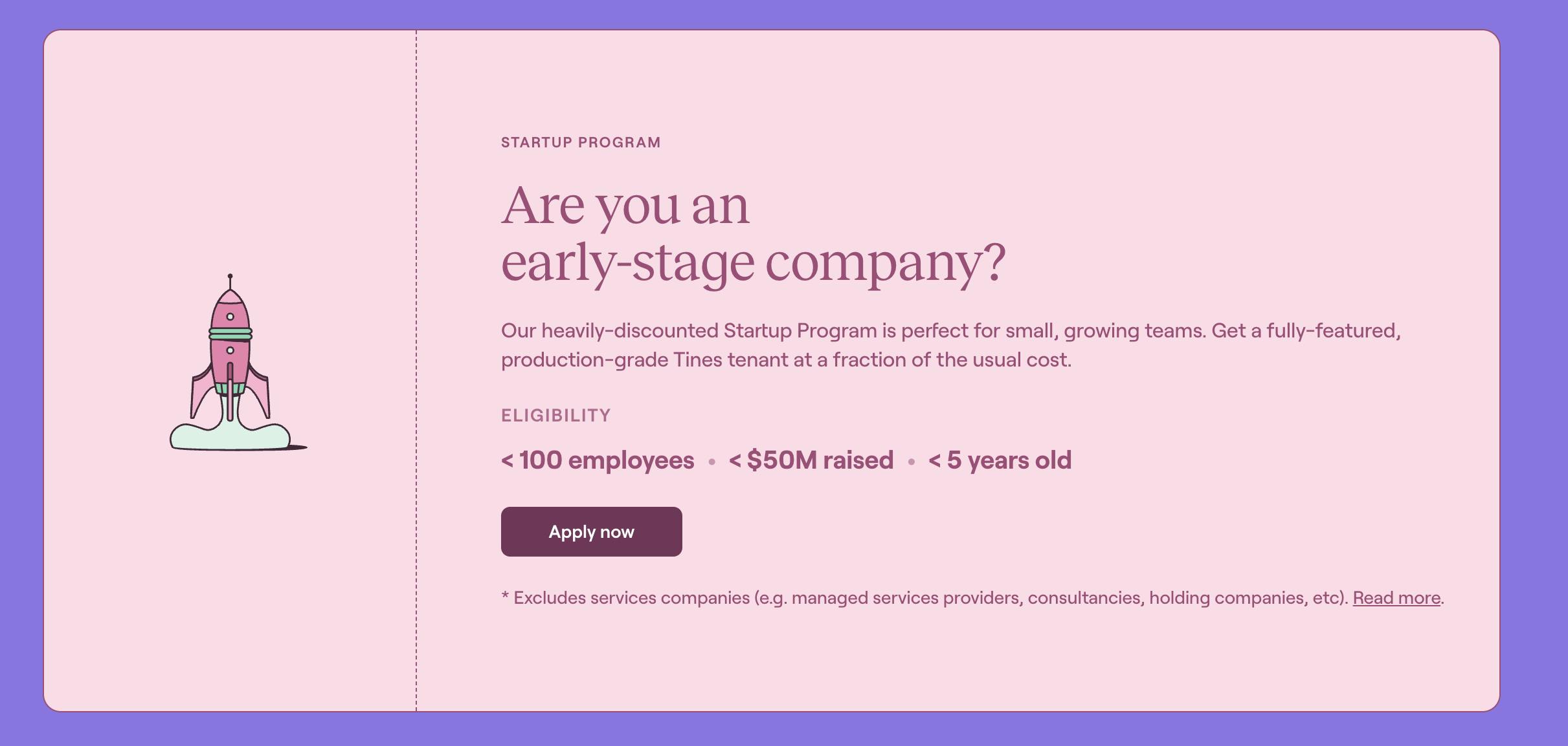 As of July 2025, Tines offers an early-stage company solution to companies with fewer than 100 employees, less than $50 million in venture capital raised, and less than five years old. This solution allows them to acquire a full enterprise package at a “fraction of the usual cost”.
