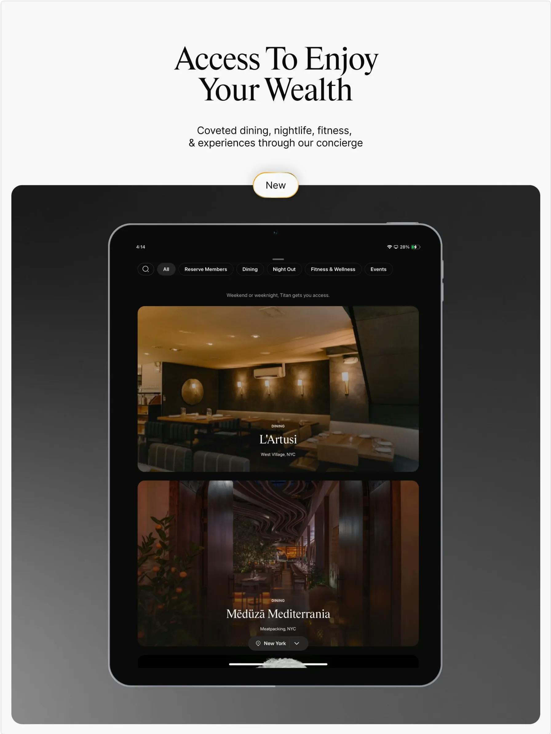 Members also receive "Titan Access," a concierge service offering exclusive opportunities such as concert passes, restaurant reservations, and invitations to private events or discussions with industry leaders. This service operates with a transparent supply of offerings, all displayed in real-time within the Titan app, allowing members to stay informed about available perks.