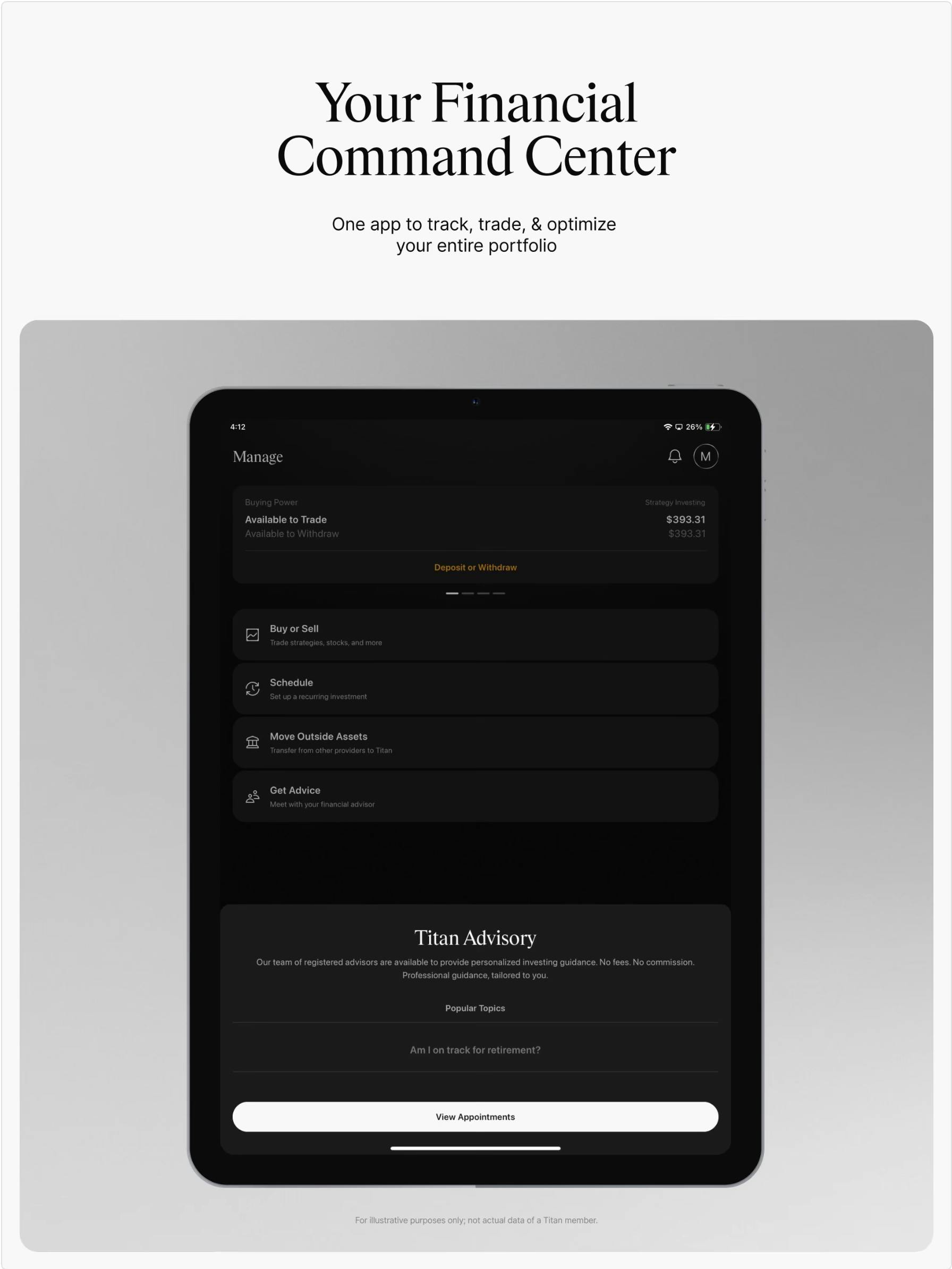 Compared to these competitors, Titan offers a more hands-on, educational approach to wealth management. While robo-advisors provide automated, hands-off investing, Titan focuses on bringing clients closer to the decision-making process, helping them better understand the specific investments in their portfolio.