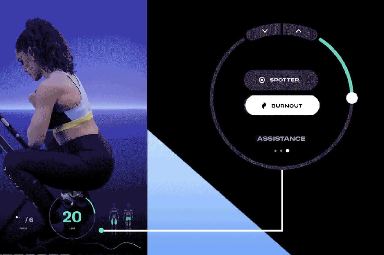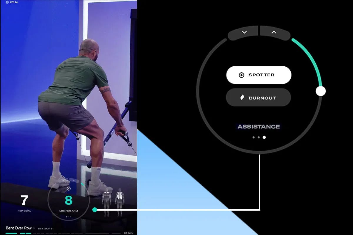 Spotter mode is on by default for more than 200 movements. Similar to a human spotter in a gym, Spotter mode automatically detects when a user is struggling to complete a rep, and automatically reduces the weight to help them complete the set. It will also restore the original resistance when it detects the weight is no longer causing the user to struggle.