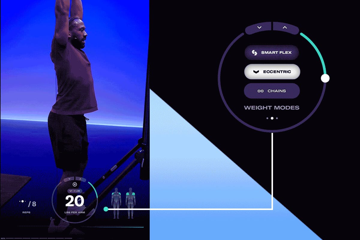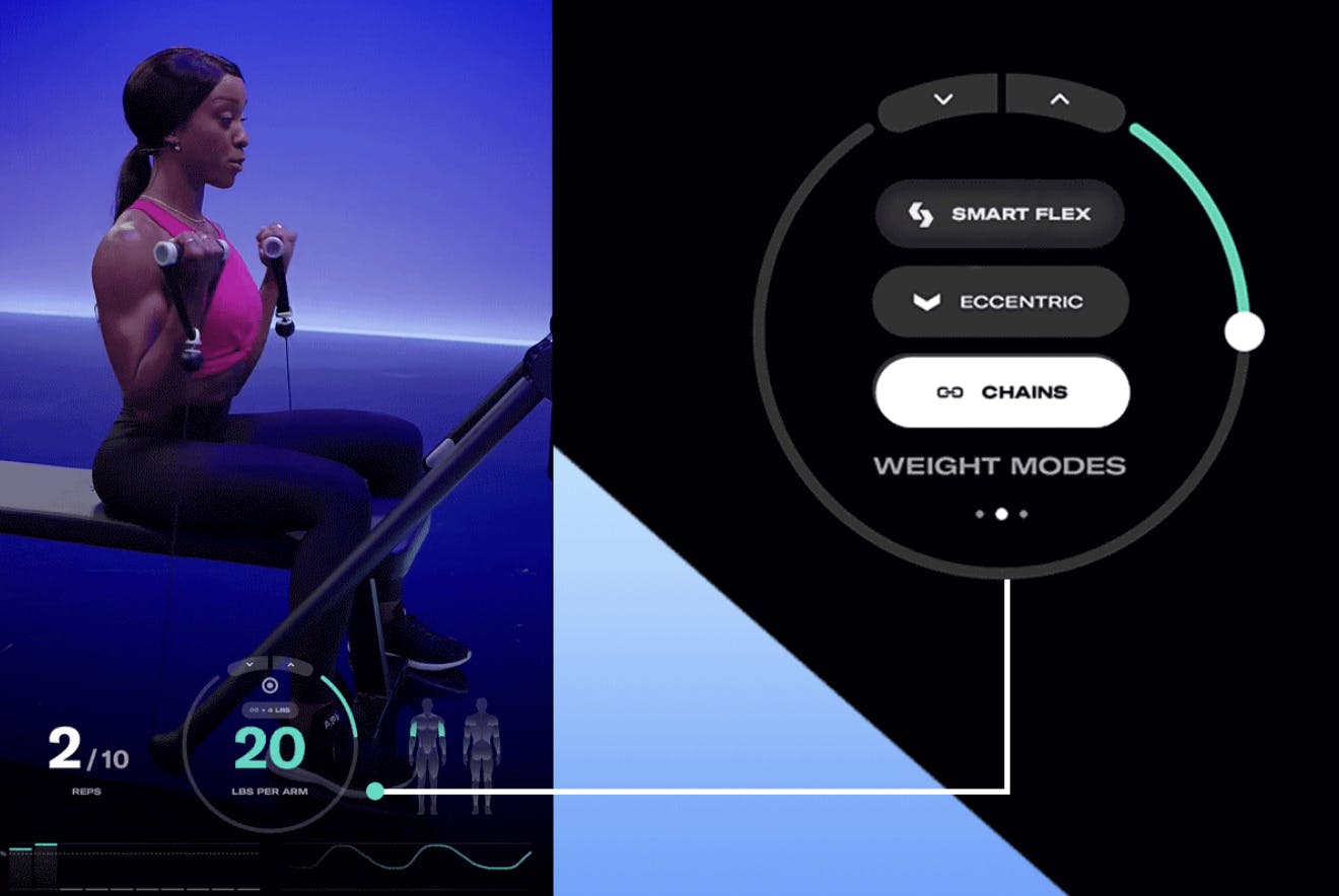 The adaptive weight system conducts thousands of calculations per second and monitors users’ forms to adjust the resistance they experience in real time. The electromagnetic motor also prevents users from relying on momentum to help with each rep and supplies resistance on the eccentric, the part of the movement in which the muscle is lengthened, and the concentric, the part of the movement when the muscle contracts, phase of the exercise. As a result, Tonal weights feel slightly heavier than traditional metal weights.
