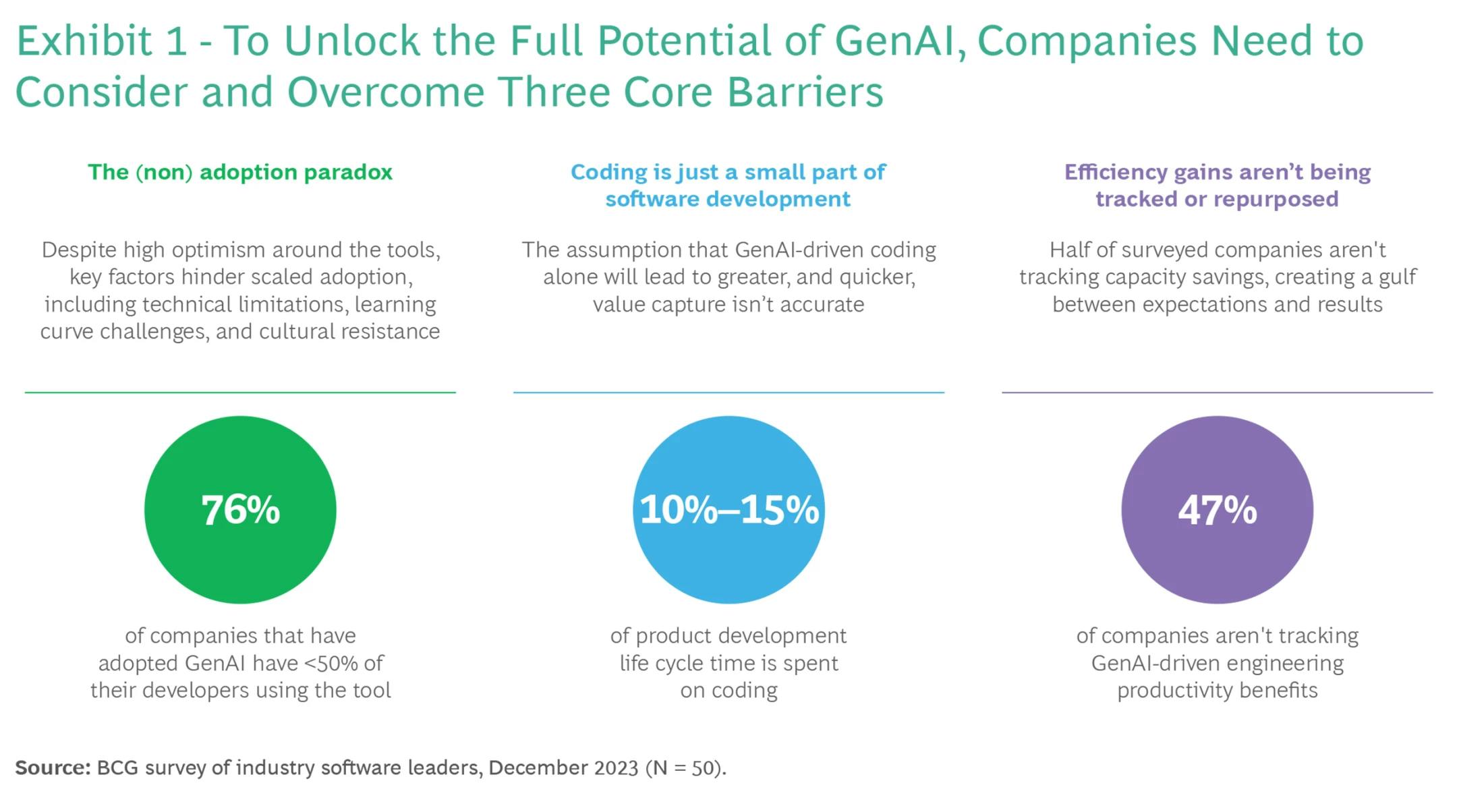 Another hurdle is the complexity of mature enterprise codebases. GenAI tools struggle with integration into legacy systems, internal libraries, and complex debugging or refactoring. These limitations arise from a lack of contextual understanding and alignment with organizational coding standards and architectures. This often results in compatibility issues, increased bug rates, and resource-intensive debugging efforts. Additionally, shallow integration into development workflows and low developer trust further hinder widespread adoption.