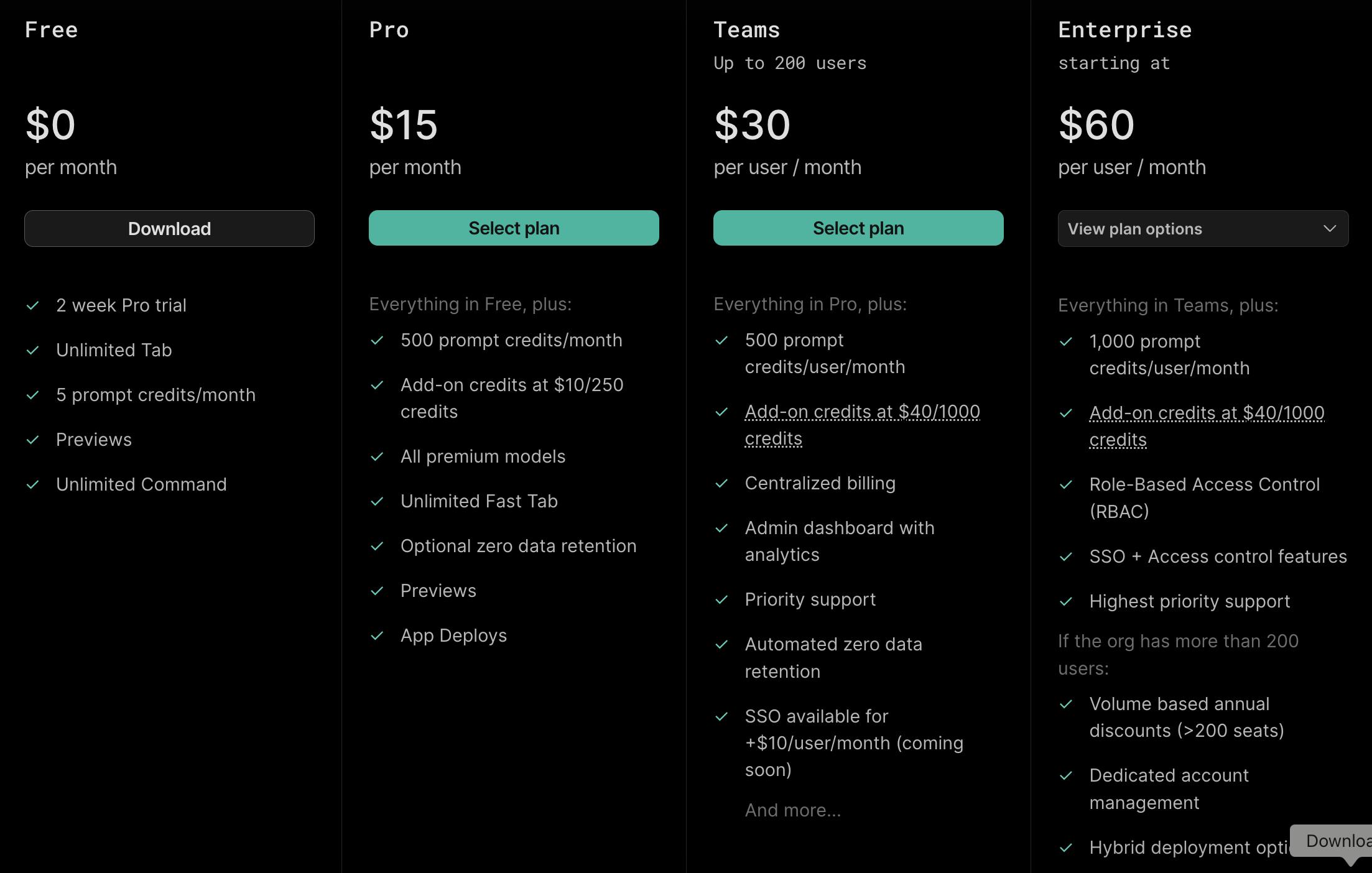 Pro ($15/month): 500 prompt credits/month, premium model access, unlimited Fast Tab, optional zero data retention, previews, and app deploys. Additional credits available at $10 for 250.