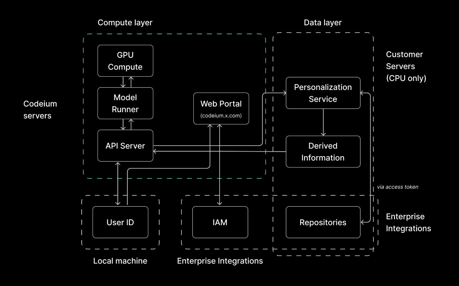 As a result of the Codeium team’s expertise in large scale ML infrastructure, Codeium Enterprise can run on relatively inexpensive hardware per developer, be set up in less than a day by integrating with your existing Identity and Access Management (IAM) and Source Code Management (SCM) systems, and requires no continuous monitoring and maintenance from the enterprise.