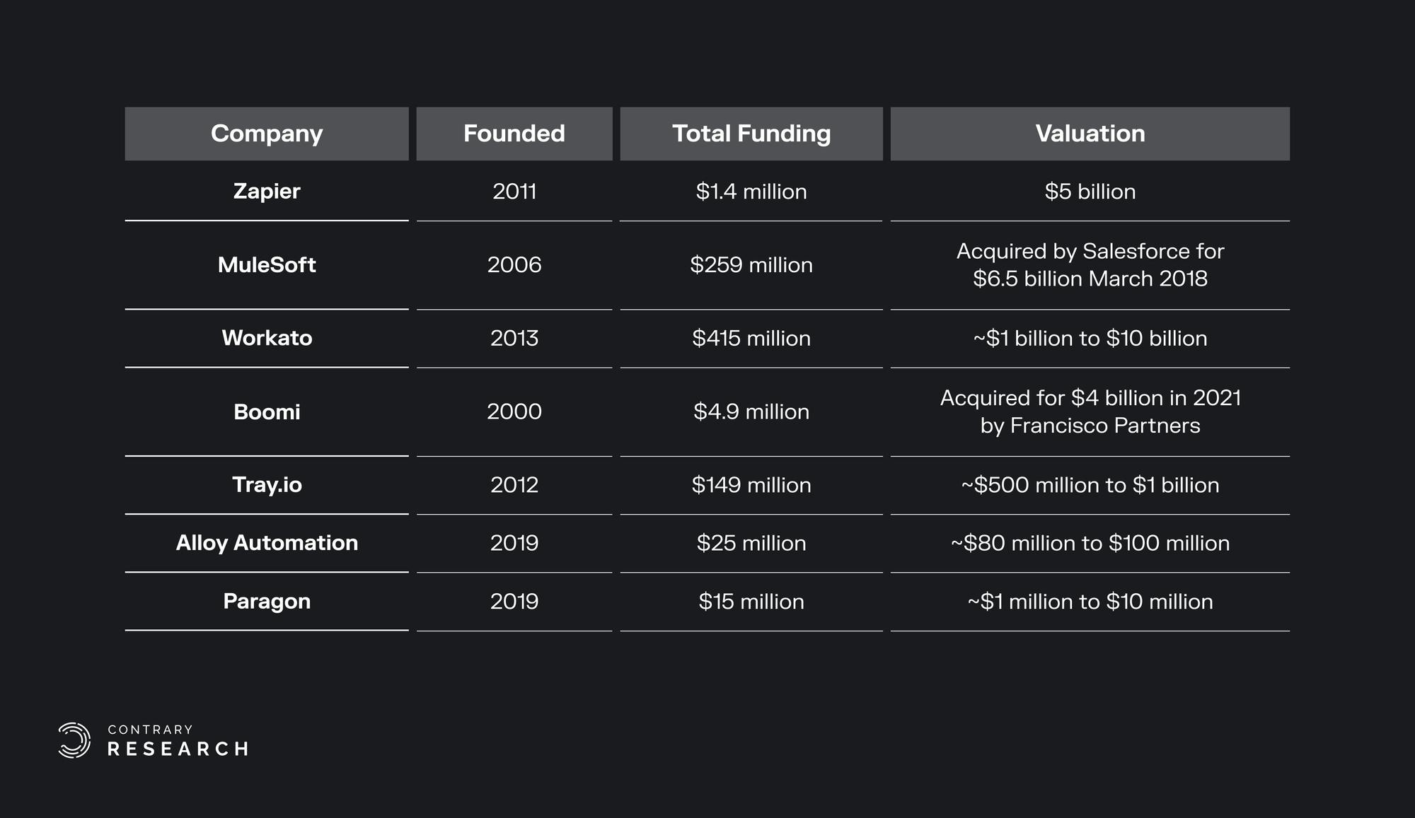 There are a number of different tools that have built products to serve the integrations-platform-as-a-service (iPaaS) market. Most of them have primarily served enterprise use cases around building more deeply entrenched integrations within a company’s core systems (e.g. CRM, HRIS). First-generation tools included MuleSoft, which was acquired by Salesforce in 2018 for $6.5 billion, and Boomi, which was acquired by DELL in 2010 and then sold in 2021 to TPG and Francisco Partners for ~$4 billion. Other players in the enterprise iPaaS space include SnapLogic, which raised $165 million at a $1 billion valuation in December 2021, and Workato, which raised $200 million at a $5.7 billion valuation in November 2021.