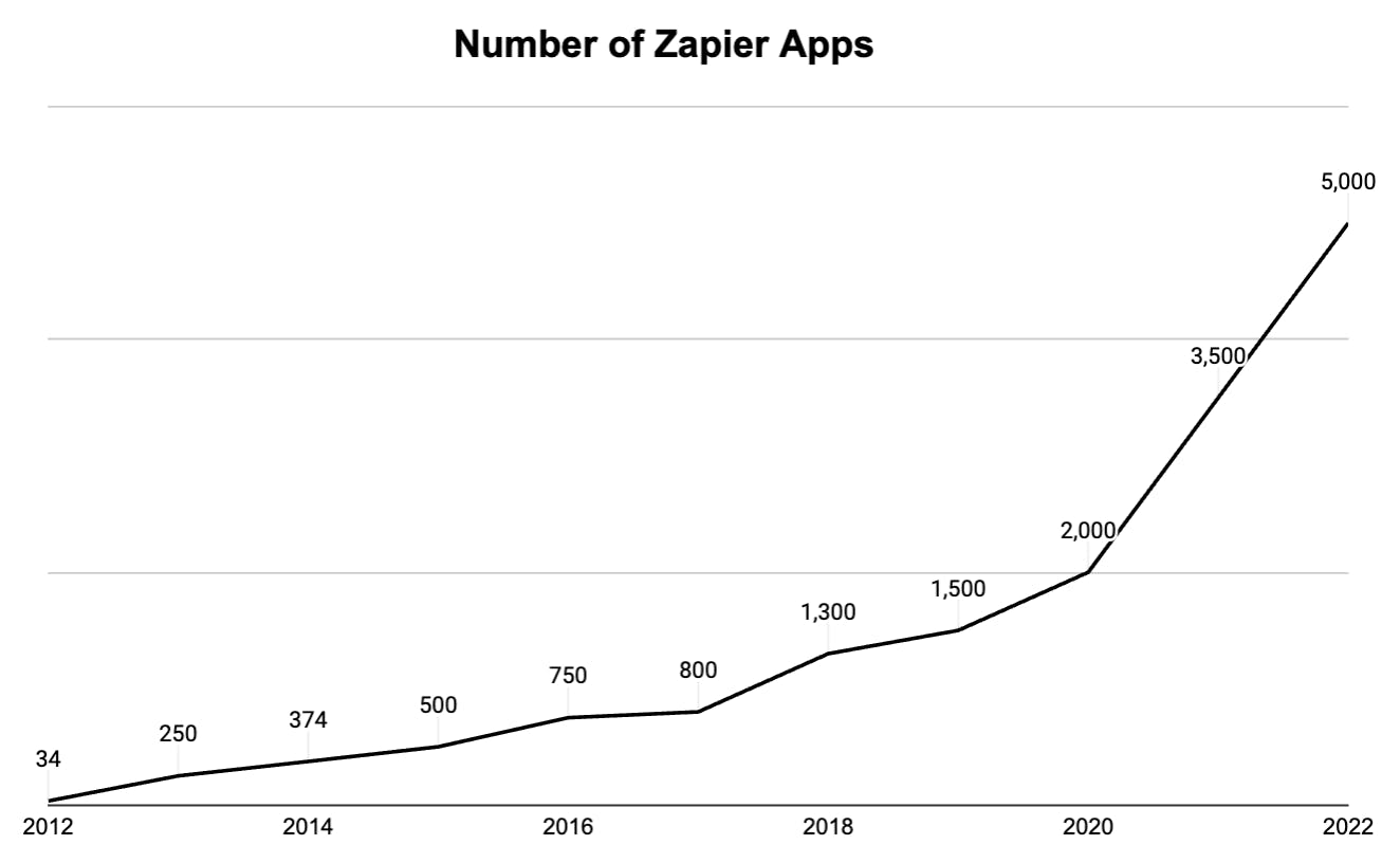 Between 2012 and 2015, Zapier scaled to 600K customers. As of September 2023, Zapier claims that it is the “automation platform of choice” for 99% of Forbes Cloud 100 companies, and for 69% of the Fortune 1000. Zapier’s landing page also highlights notable customers like Dropbox, Lyft, HelloFresh, Miro, Asana, Calendly, and Zendesk among its 2 million customers. The number of apps that Zapier integrates with has continued to grow, reaching more than 6.5K as of October 2023.