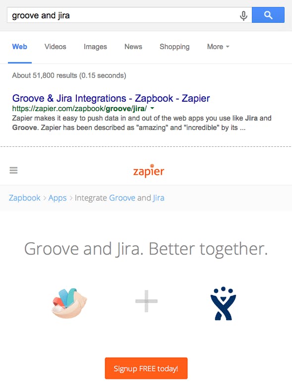They found that Y Combinator’s acceptance helped improve response rates when they cold-emailed popular SaaS companies, opening the doors to more partnerships and even founder support. Reminiscent of Zapier’s first forum-based growth hack, the team found themselves googling popular companies and possible integrations to test demand. Soon, the team found a way to use SEO to capture traffic, setting up landing pages for as many app-to-app connections as possible so that Zapier would show up in search results as shown below: