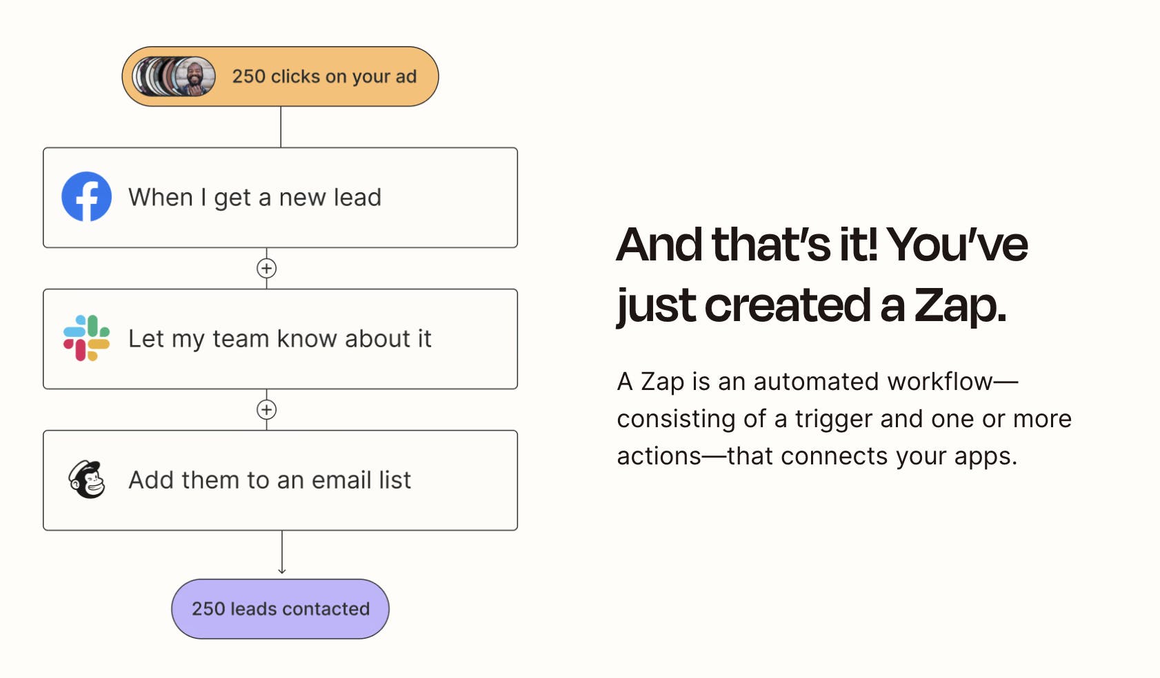 Zaps can be set up so that the trigger leads to multiple steps. For example, the trigger of a new Facebook lead can lead to the addition of that lead to a Mailchimp list as well as an automated Slack notification.