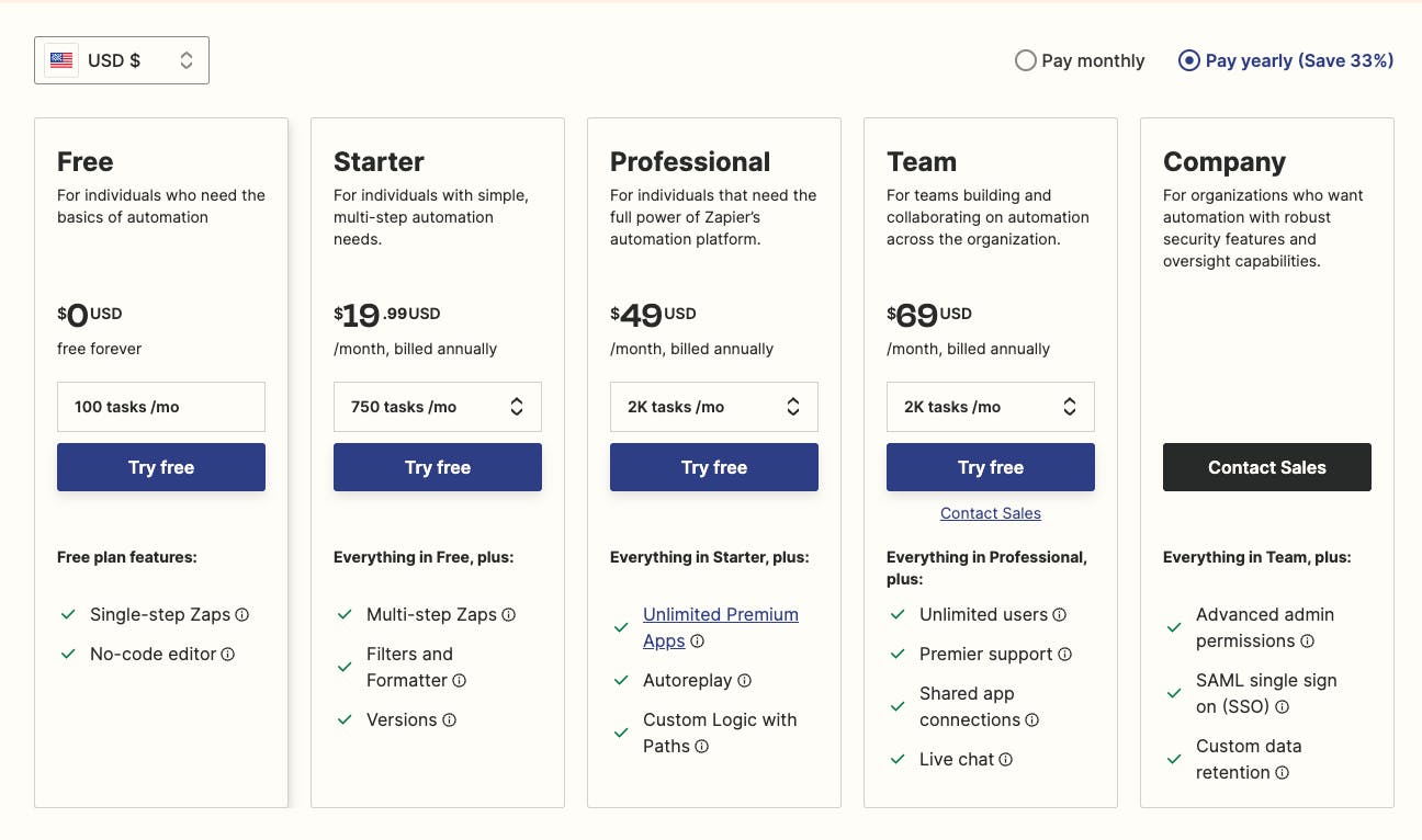 Zapier has five subscription pricing tiers, with its lowest paid plan starting at $19.99 per month, billed annually ranging, to as high as $599 per month. Subscription plans are differentiated by the number of tasks that can be performed per month using Zapier workflows.
