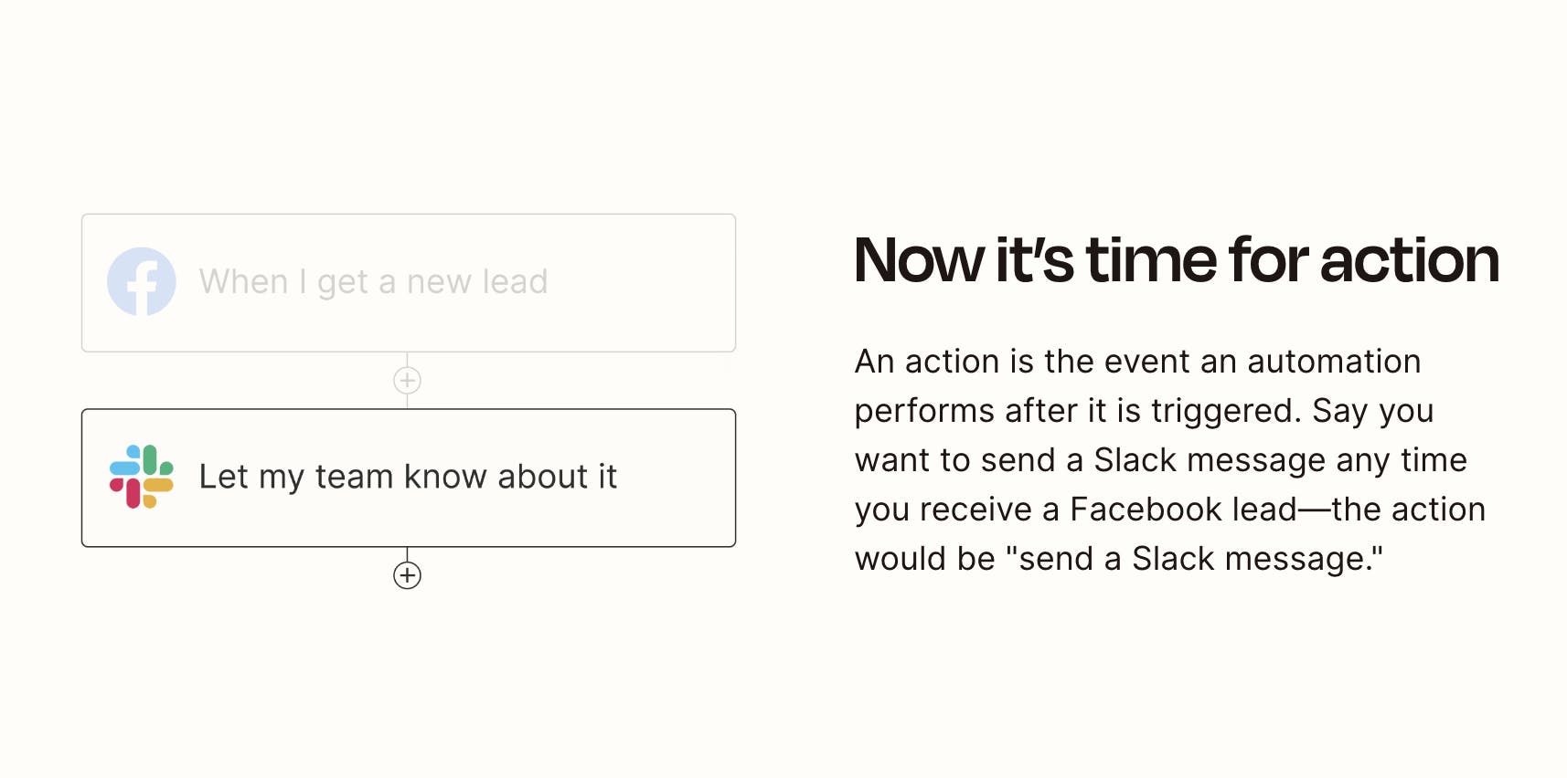 Once a trigger has been set up and connected, the user is asked to connect a second app that will be completing an action. For example, a new Facebook lead can be used to automatically trigger a team-wide Slack message. When the user is ready, they can publish the Zap, so the integrations will run automatically going forward.