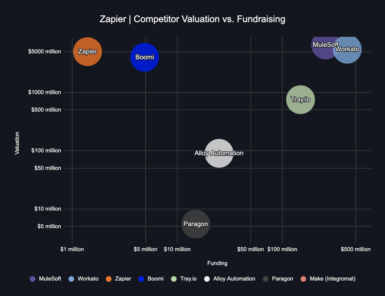 Zapier’s relative lack of venture funding makes its ARR per dollar raised relatively high, having raised $1.4 million and achieving $140 million in ARR, implying a 100x ARR to funding ratio. The company has also achieved a $5 billion valuation despite its lack of reliance on outside investment. Other companies in the integration space with similar valuations have either been acquired (Boomi) or raised much more, ranging from $259 million (MuleSoft) to $415 million (Workato).