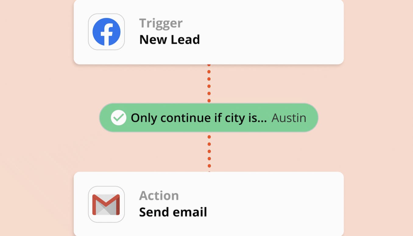 Filters allow Zaps to specify the conditions under which a trigger will lead to an action. For example, if the trigger event is a new lead on Facebook, and the consequent action of the workflow is to send an email (as illustrated above), filters can be imposed to narrow the range of trigger events that lead to the consequent action. Filters can be applied based on any kind of data provided. For example, instead of all Facebook leads constituting a trigger event for the workflow, filters allow users to narrow the trigger event to only Facebook leads from a particular location.