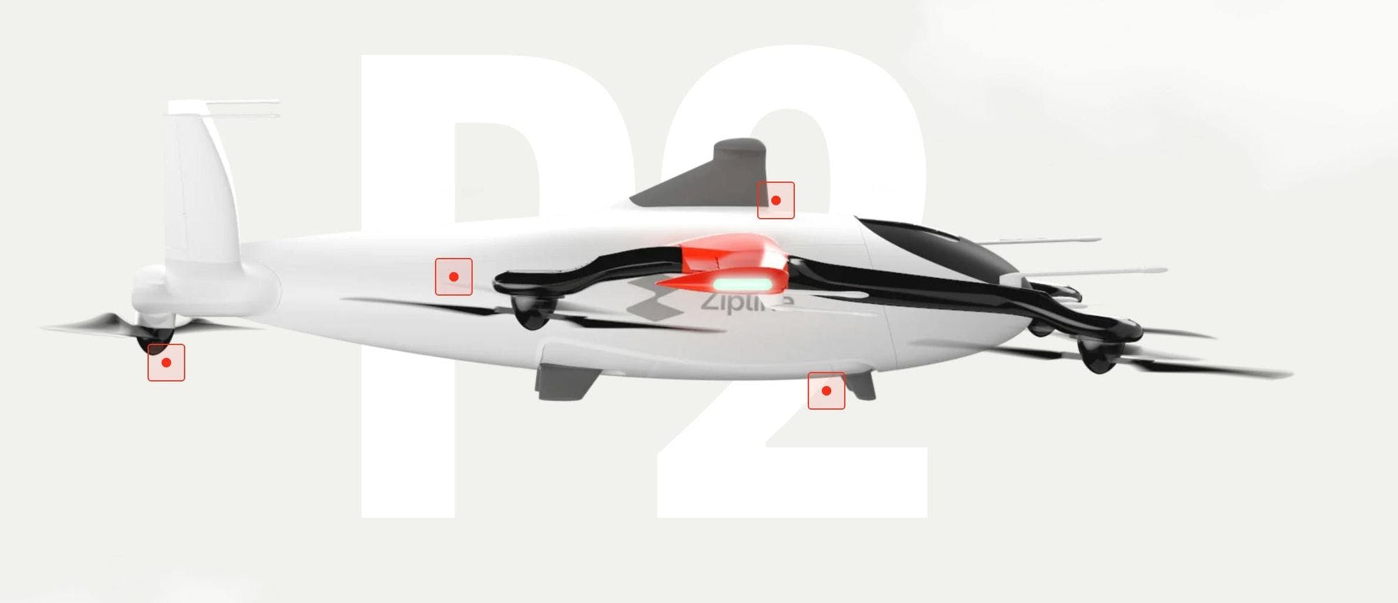 P2 Zips have fixed wings, like P1 Zips, but they also have propellers that allow them to hover and help them more precisely maneuver when conducting local deliveries, especially in inclement weather.