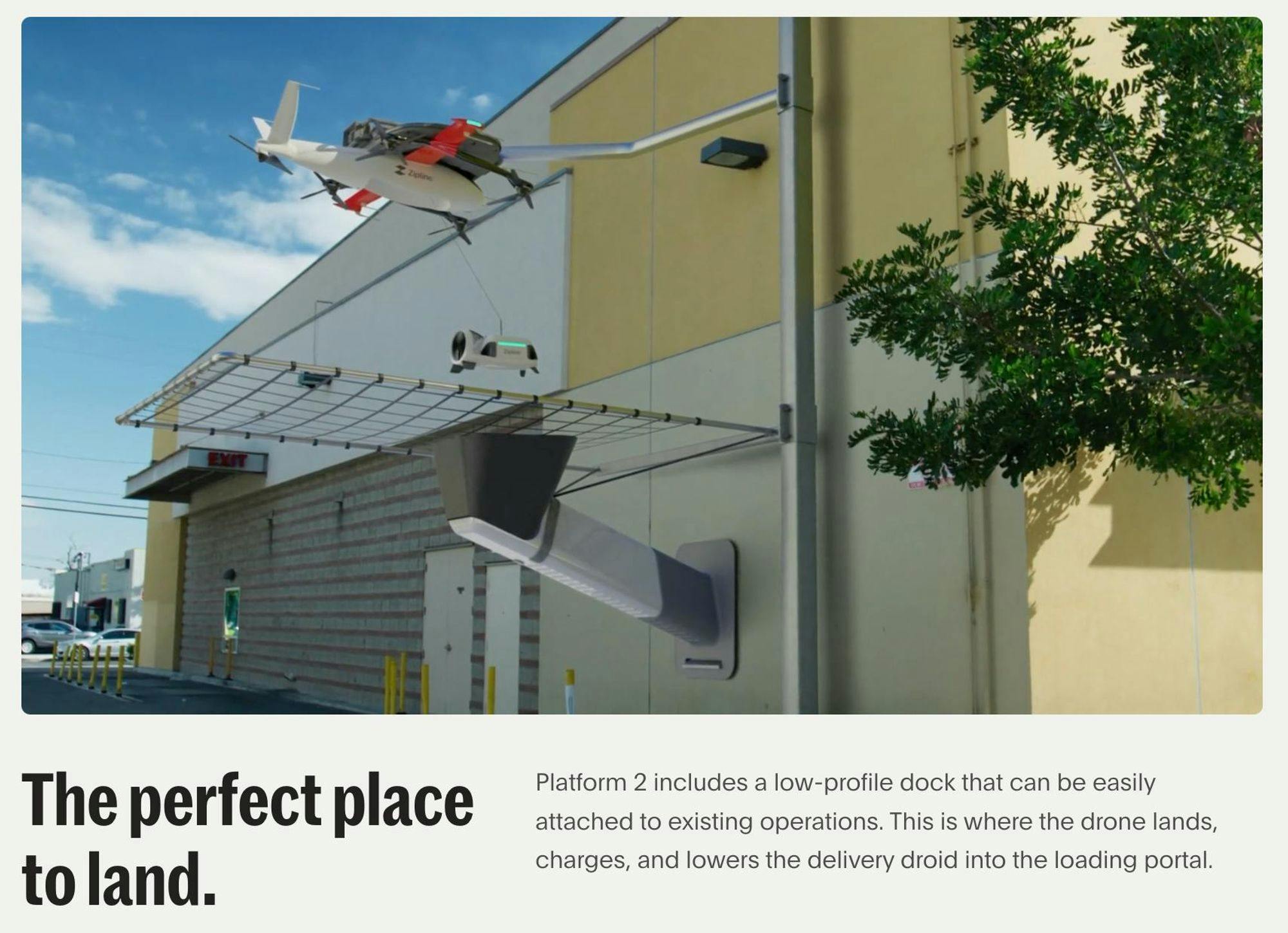 P2 Zips are able to deliver packages precisely to a doorstep or any other designated precise location, such as a patio table, with the use of delivery droids that lower from the body of the P2 Zip, which hovers at about 300 feet above ground level, and can use “onboard perception to leave packages exactly where they’re supposed to go.” And as with P1 Zips, P2 Zips are designed to be ‘almost inaudible.”