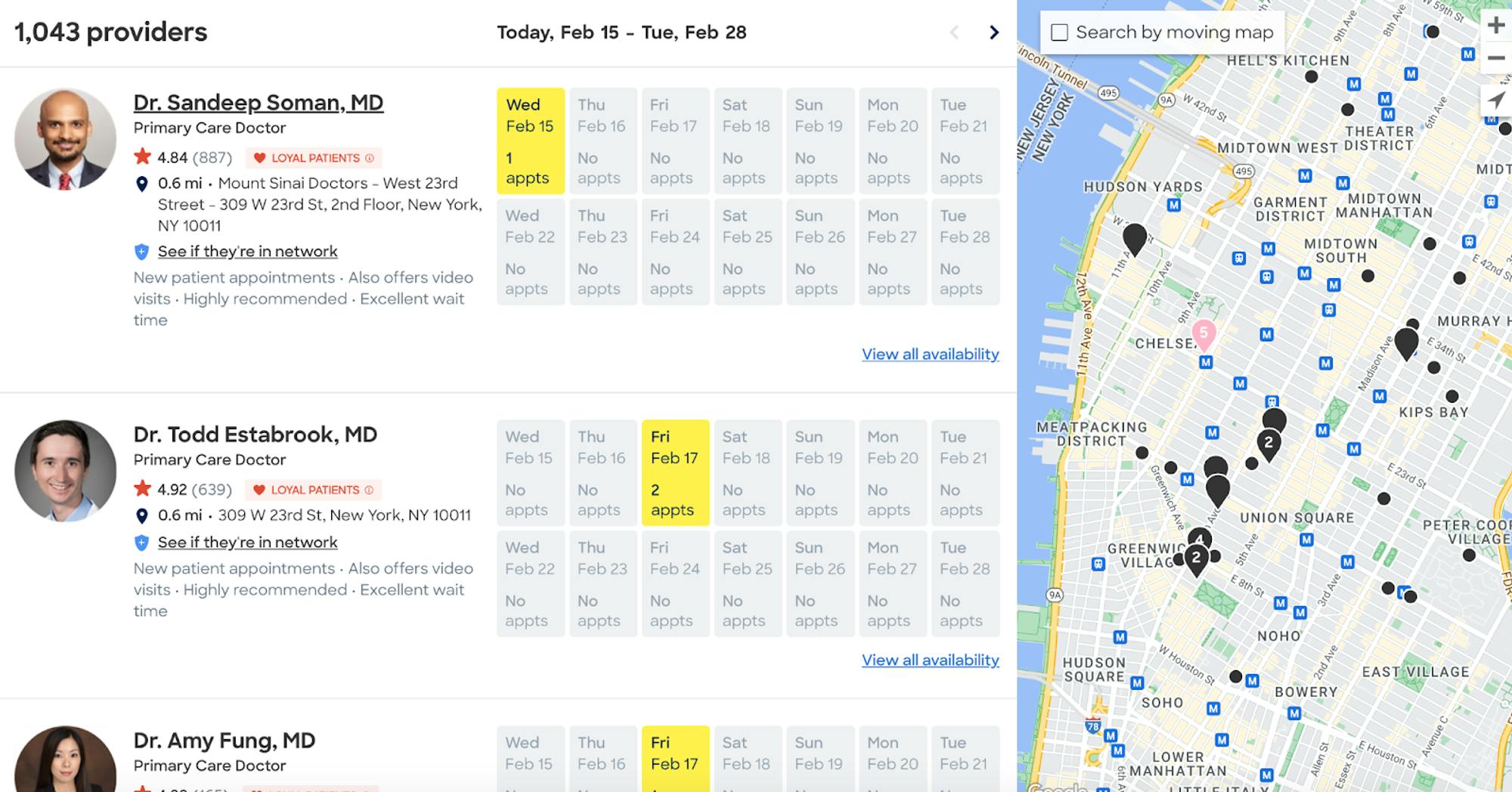 Patients can apply filters like location, insurance coverage, and wait time to narrow their search. Each physician shows appointment availability. Reviews help patients in making sure it is the right fit. Based on historical data, it also shows an estimated in-office wait time.
