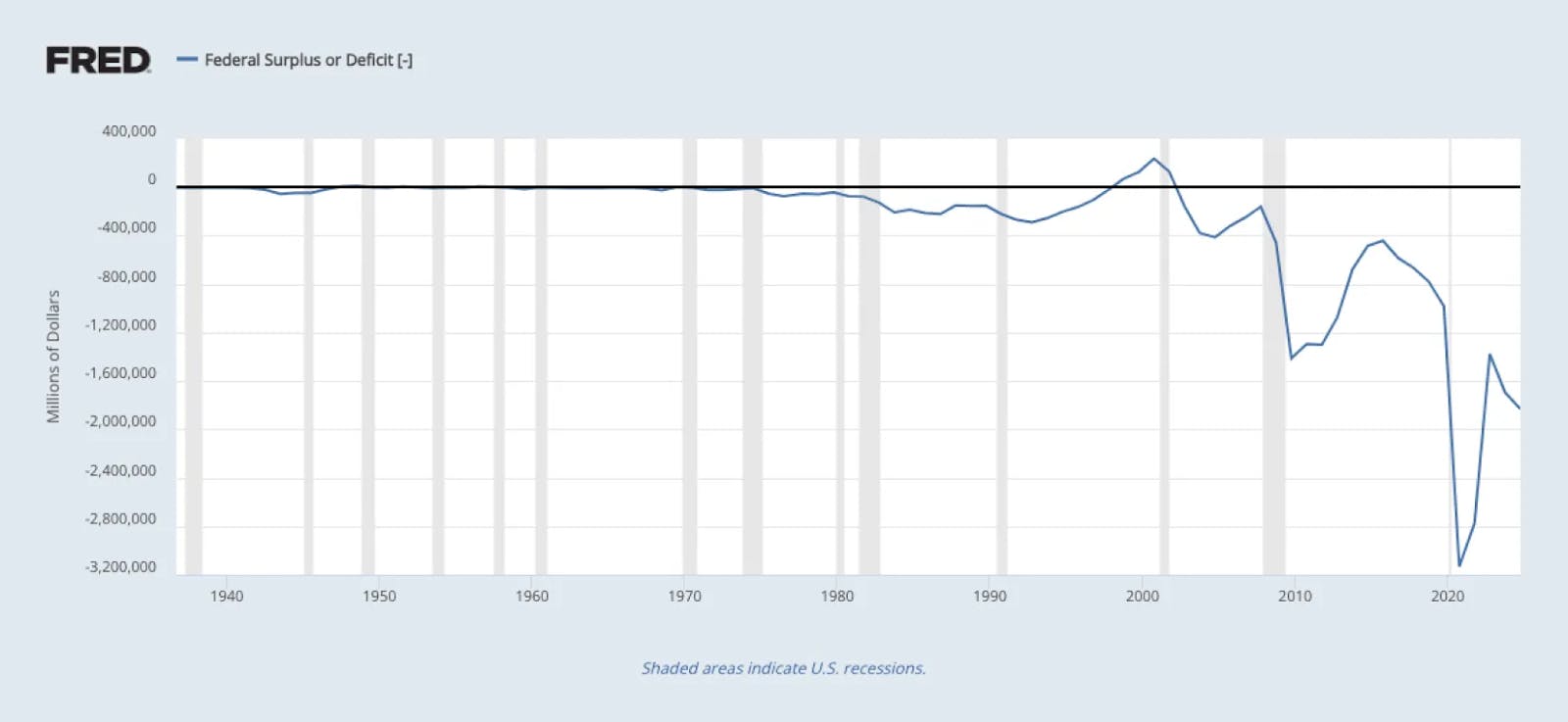 For the last 23 years the US government has been breaking the golden rule of budgeting: make more money than you spend. In 2024, about 50% of the entire budget deficit went just to paying interest on our accumulated debt