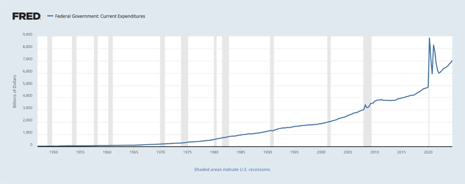 Businesses are cyclical, with revenue and earnings rising and falling with changing market conditions. However, US government spending has consistently increased regardless of market conditions: