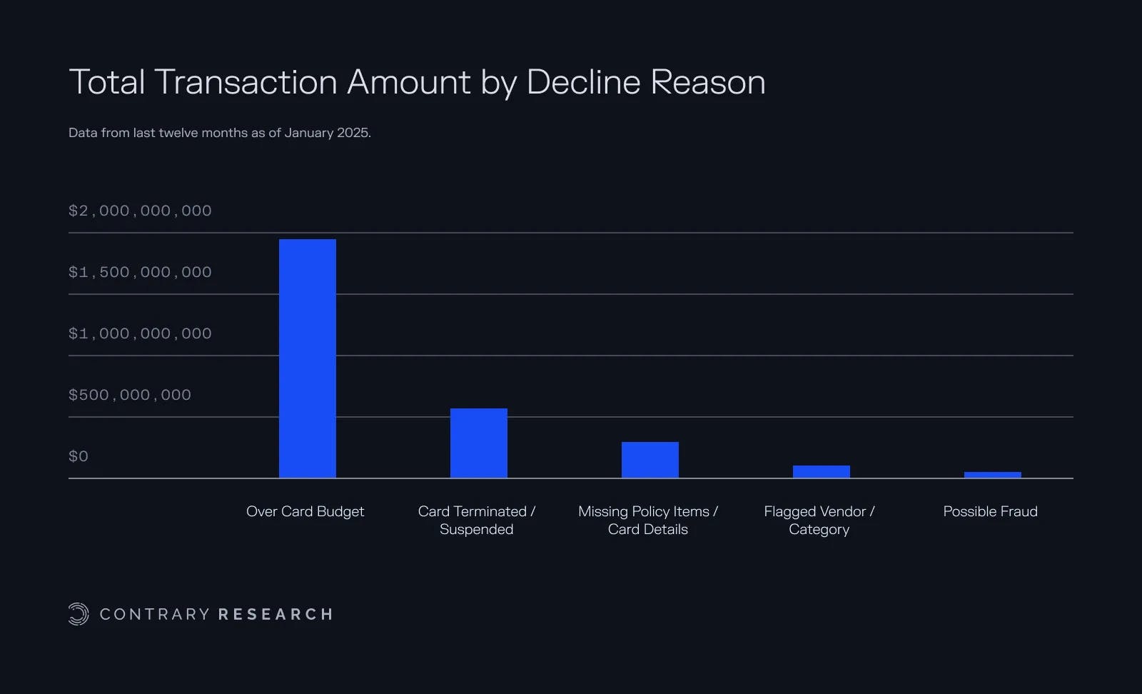Flagged or declined transactions can feel synonymous, but both are valuable. Declined transactions can be set up for any number of reasons to ensure inefficient spend doesn’t occur in the first place. Card limits, suspended or terminated cards, and missing policy items are some of the common drivers behind Ramp's millions of declined transactions.