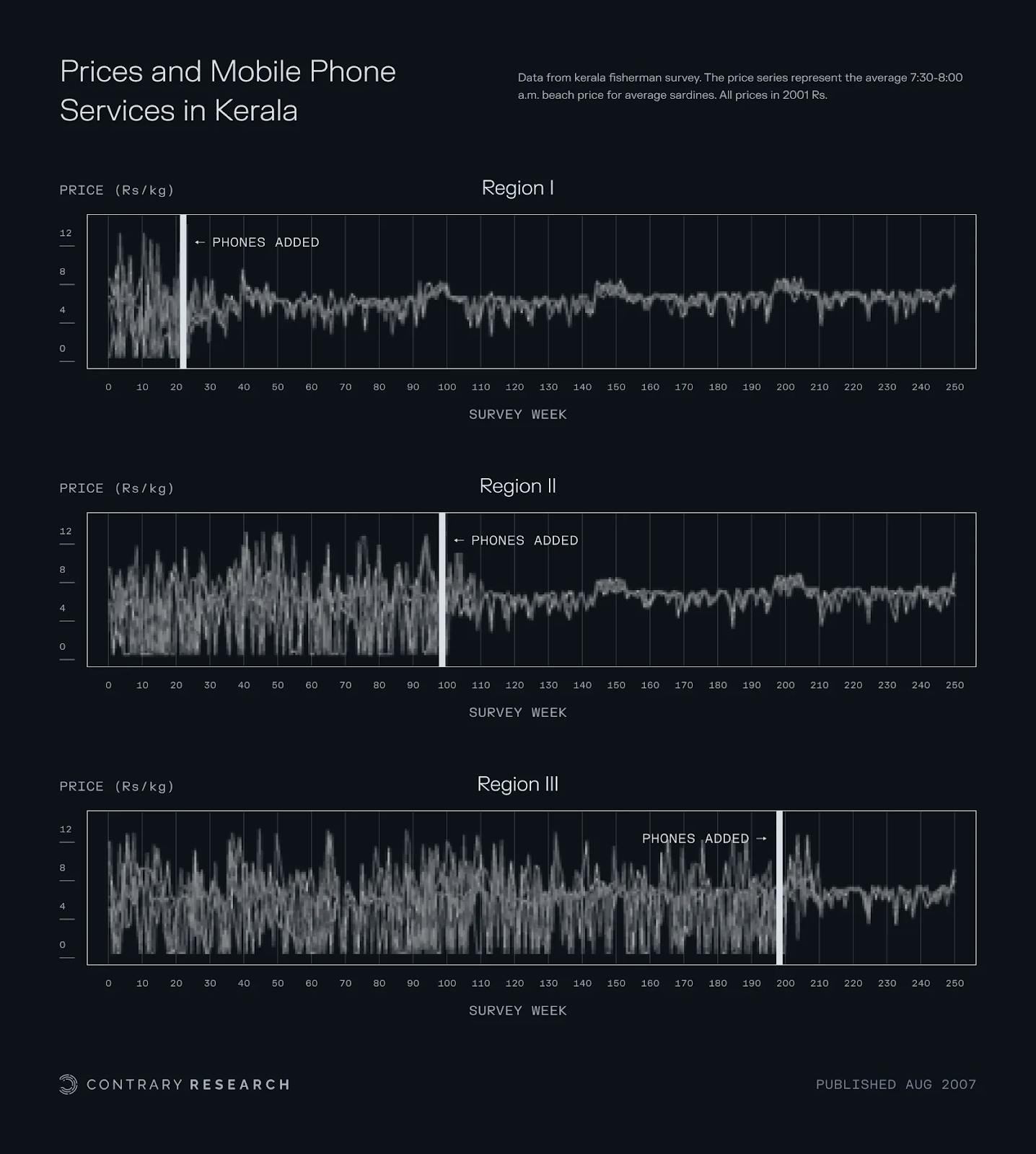 Look no further than Indian fish markets in the early 2000s to illustrate that point: a 2007 study of South Indian fisheries found that “the adoption of mobile phones by fishermen and wholesalers was associated with a dramatic reduction in price dispersion.” Turns out that as soon as each participant in a transaction has more context on the current price they are more likely to avoid overpaying.