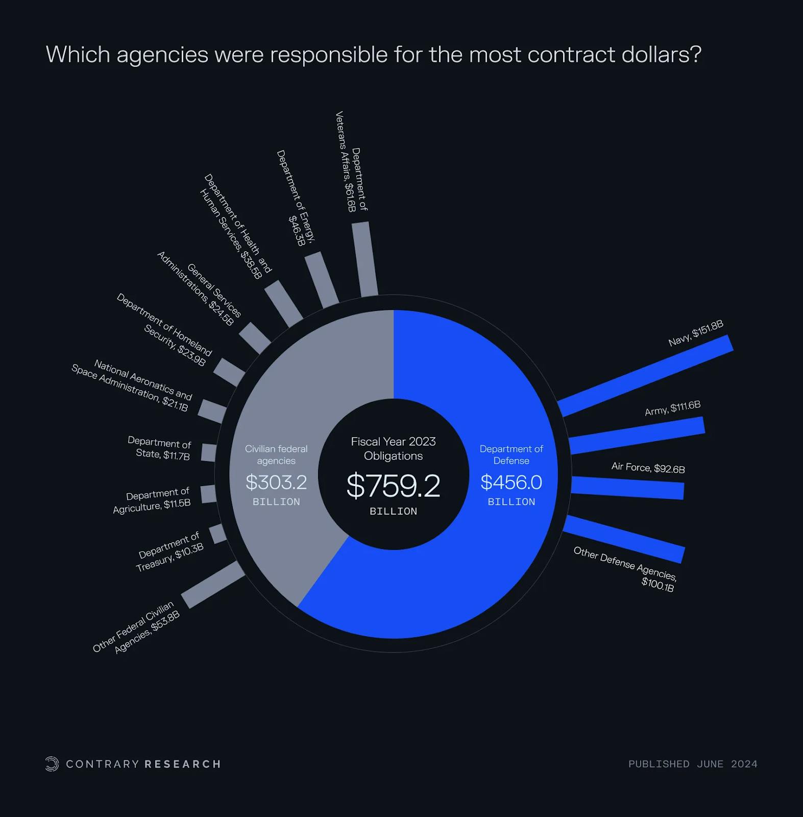 In 2023 the US government spent $759 billion on contractors, with 60% of that spend coming from the Department of Defense. The spend was spread across over 600K entities that fill government contracts. Some estimates indicate up to a quarter of that spend could be inefficient – from price gouging to improper reimbursements to geographic disparities due to special interests. It adds up pretty quickly.